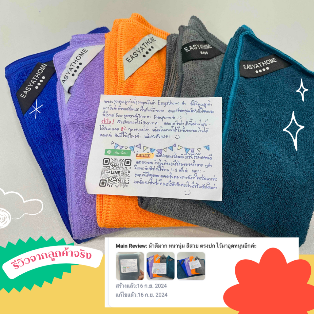 ... ายถึง 8 เท่า ทำให้สามารถเช็ดน้ำหรือฝุ่นออกจากพื้นผิวต่างๆ ได้อย่างรวดเร็วและมีประสิทธิภาพ ทนทาน: ผ้าไมโครไฟเบอร์ของ Easyathome นั้นทนทานต่อการซักมากกว่า 1,000 ครั้ง เหมาะสำหรับการใช้งานที่หนักหน่วง ทำความสะอาดได้หลายพื้นผิว: ผ้าไมโครไฟเบอร์ของ Easyathome นั้นปลอดภัยสำหรับใช้กับทุกพื้นผิว ไม่ว่าจะเป็นท็อปครัว เครื่องใช้ในครัว ห้องน้ำ กระจก ฯลฯ แห้งเร็ว: ผ้าไมโครไฟเบอร์ของ Easyathome นั้นแห้งเร็ว ช่วยให้คุณประหยัดเวลาและพลังงาน อเนกประสงค์: ผ้าไมโครไฟเบอร์ของ Easyathome นั้นสามารถใช้ทำความสะอาดได้หลากหลาย เช่น เช็ดจาน เช็ดกระจก เช็ดรถ ฯลฯ ดูแลง่าย: ผ้าไมโครไฟเบอร์ของ Easyathome นั้นดูแลง่าย เพียงซักด้วยน้ำเปล่าหรือน้ำยาล้างจาน/น้ำยาซักผ้า หมายเหตุ: โปรดอ่านรายละเอียดสินค้าให้ครบถ้วนก่อนสั่งซื้อ - ผ้าทำความสะอาดของเรา อาจมีสีตกเล็กน้อยใน 1-2 ครั้งแรกของการซัก เป็นเรื่องปกติ เนื่องจากผ่านกรรมวิธีการย้อมทับหลายชั้นเพื่อความทนทานของสี มั่นใจได้เลยว่า สีจะติดแน่น คงความสดใส ดำเข้ม ยาวนาน แนะนำให้ซักแยกต่างหากใน 1-2 ครั้งแรกก่อนใช้งาน -ออกใบกำกับภาษี กรุณาแนบข้อมูลหลังทำการสั่งซื้อ -จัดส่งทุกวัน สินค้าไม่ตรงปก คืนเงินเต็มจำนวน รอบจัดส่ง ร้านเราจัดส่งทุกวัน ตัดรอบทุกวัน จ.-อา. เวลา 10:00น. คำสั่งซื้อที่เข้ามาก่อน 10:00น. จะจัดส่งในวันเดียวกัน คำสั่งซื้อหลังจากนั้นจะจัดส่งในวันถัดไป เรียนลูกค้าที่เคารพทุกท่าน, ขอขอบคุณที่สนับสนุนสินค้าของเราอย่างต่อเนื่อง ด้วยความมุ่งมั่นในการนำเสนอสินค้าที่มีคุณภาพดีที่สุดให้กับทุกท่าน เราขอแจ้งให้ทราบว่า เนื่องจากต้นทุนการผลิตและการดำเนินงานที่สูงขึ้น เราจำเป็นต้องปรับราคาสินค้าบางรายการเล็กน้อย เพื่อให้เราสามารถรักษามาตรฐานคุณภาพที่คุณไว้วางใจได้ การปรับราคาใหม่จะมีผลตั้งแต่วันที่ 1 ตุลาคม 2567 เป็นต้นไป โดยเราขอสัญญาว่าจะยังคงมุ่งมั่นในการให้บริการที่ดีที่สุดและสินค้าที่มีคุณภาพสูงสุดเสมอ หากมีข้อสงสัยเพิ่มเติม สามารถติดต่อทีมงานของเราได้เสมอ ขอขอบคุณที่เข้าใจและสนับสนุนเรามาโดยตลอด ด้วยความเคารพ, Easyathome