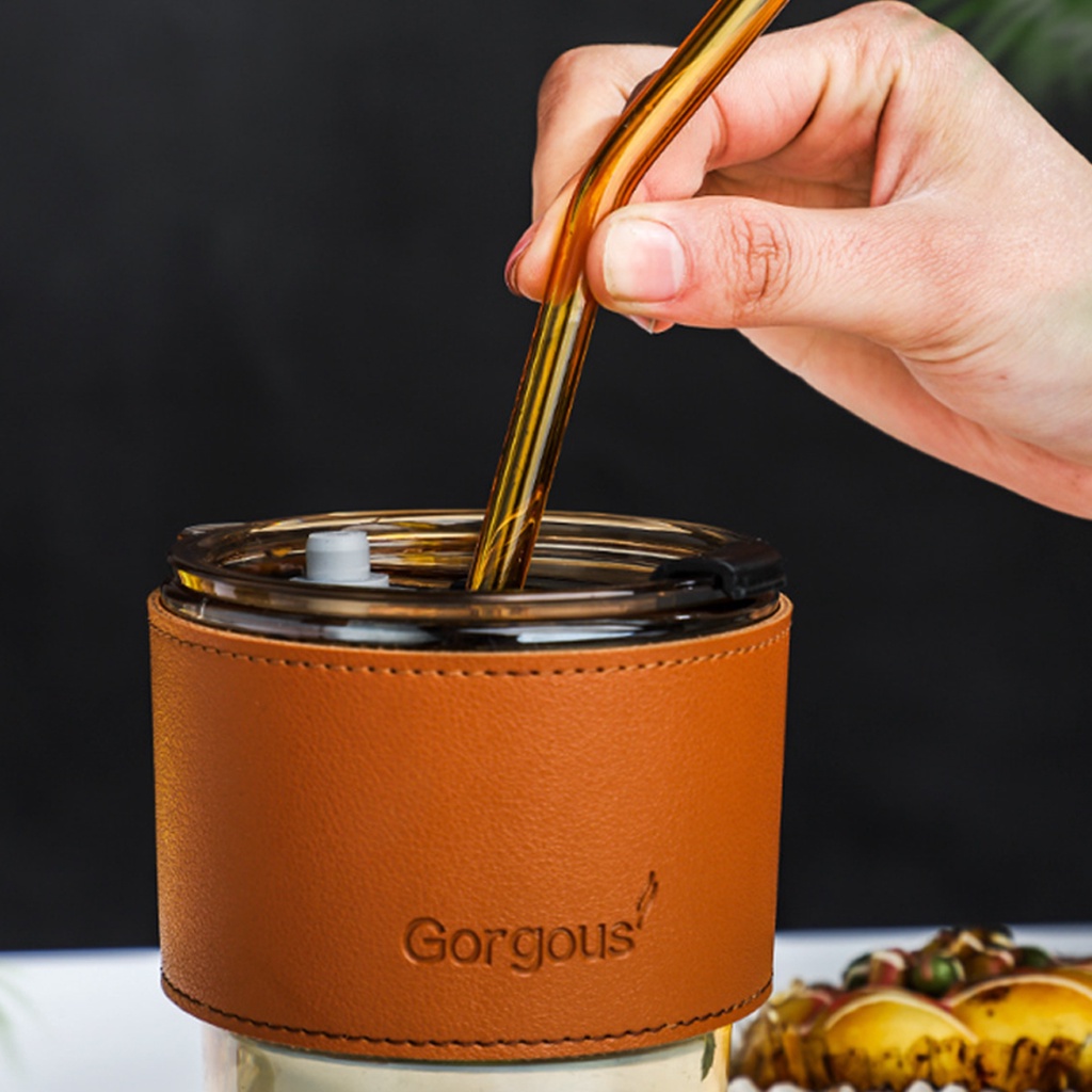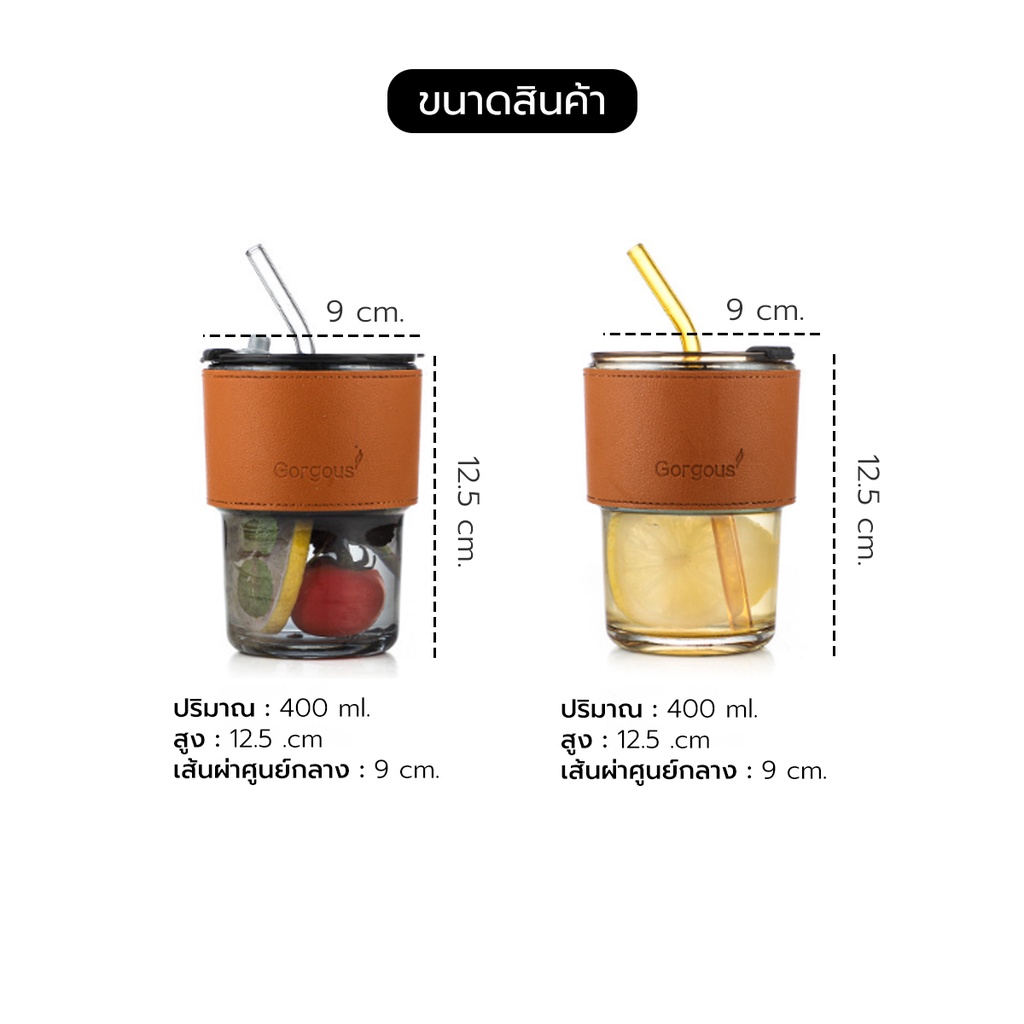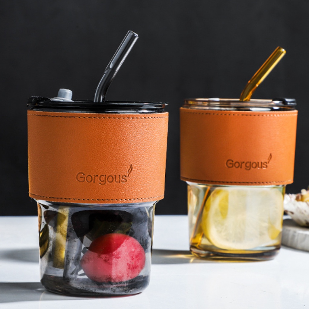 YIWUSHOP ปลีก/ส่ง แก้วกาแฟ 400ml สไตล์มินิมอล พร้อมหลอดแก้ว ฝาปิด ปลอกหนังกันร้อน
