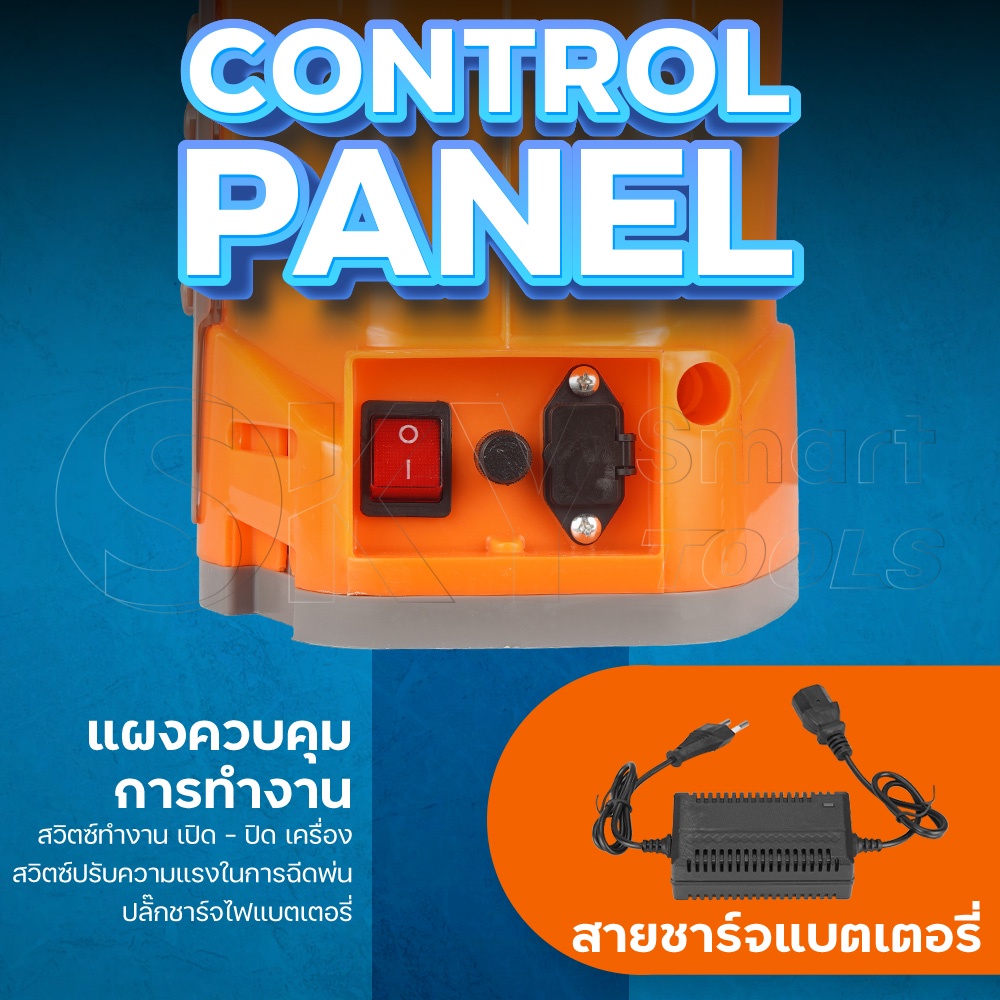 SKY TOOLS เครื่องพ่นยาแบตเตอรี่ 12V (เเรงดัน 0.2-0.3 mpa หรือ 5.5 bar ) - มีวอลลุ่มปรับระดับแรงดันได้ - ตัดการทำงานอัตโนมัติเมื่อไม่ได้ใช้งาน - ที่ชาร์จแบตเตอรี่ - หน้าปัดแสดงไฟแบตเตอรี่ - ก้านพ่นยายืดหดได้ - แถมหัวฉีดหลายหัว - ปริมาณน้ำที่ใช้พ่น 1.2 - 1.8 ลิตรต่อนาที - ระบบออโต้ทำงา