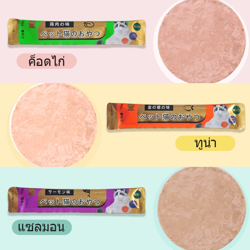 พร้อมส่ง ขนมแมวเลีย คละรสชาติ อร่อยจนเหมียวติดใจเลย ปลาทูน่า ปลาแซลมอน อกไก่ จากต่างประเทศ 15g