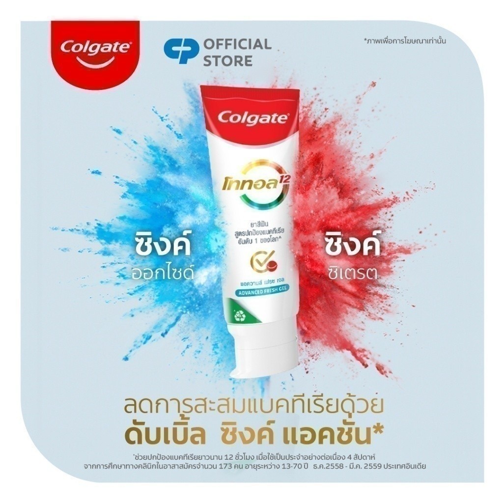 ... นส์ เฟรช สูตรใหม่ ช่วยลดการสะสมของแบคทีเรีย หนึ่งในสาเหตุสำคัญของกลิ่นปาก คอลเกตโททอลช่วยลดการสะสมของแบคทีเรียไม่เพียงแต่เฉพาะบริเวณฟันเท่านั้น แต่ยังรวมถึงลิ้น กระพุ้งแก้ม และเหงือกได้ยาวนานถึง 12 ชั่วโมง* (ยาสีฟัน , ยาสีฟันลดเสียวฟัน , คอลเกต , Colgate) *ปกป้องแบคทีเรีย 12 ช.ม. เมื่อใช้เป็นประจำอย่างต่อเนื่อง 4 สัปดาห์ จากการศึกษาทางคลินิกในอาสาสมัครจำนวน 173 คน อายุระหว่าง 18-70 ปี ธ.ค. 2558 – มี.ค. 2559 ประเทศอินเดีย Colgate Total toothpaste 150g total 4 pieces (5 formula to choose) Having fresh breath gives you the confidence to connect with the world around you. That’s why new Colgate Total Advanced Fresh toothpaste helps reduce bacteria accumulation– the root cause of bad breath – not just on teeth, but also your tongue, cheeks, and gums for 12 hours*. *Up to 12 hour of protection against bacteria with 4 weeks continuous use. From clinical study with 173 volunteers aged 18-70 years, during Dec 2015 - Mar 2016, India. #ยาสีฟัน #ยาสีฟันคอลเกต #ยาสีฟันโททอล #ยาสีฟันColgate #ยาสีฟันTotal #ดูแลช่องปาก