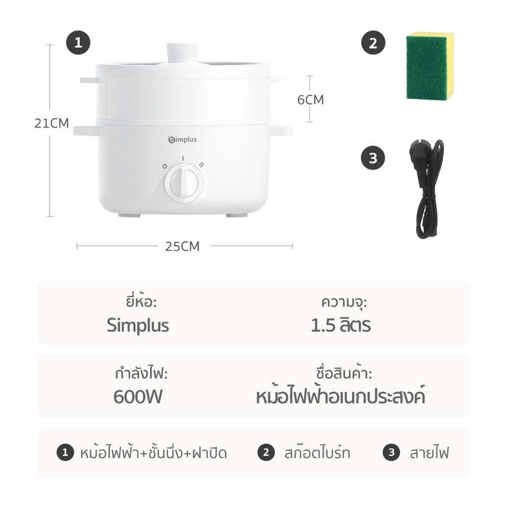... ูลเพิ่มเติม กรุณาสอบถามฝ่ายบริการลูกค้า Simplus ไม่มีเรือกลไฟ หม้อไฟฟ้าอเนกประสงค์ 600W ไม่ติดหม้อ หม้อขนาดเล็ก ควบคุมอุณหภูมิสองระดับ หม้อหุงไฟฟ้า คุณสมบัติ: ● ปุ่มปรับอุณหภูมิ 2 ระดับ ● นึ่ง, ต้ม, เคี่ยว, ผัด, ทอด, สุกี้หม้อไฟ ● เครื่องเดียวใช้งานได้หลากหลาย ● ตัวหม้อด้านในเคลือบเซรามิค ● หูจับสองหู ไม่ร้อน ● ตัวหม้อใหญ่ กว้างและลึกขึ้น ● ยี่ห้อ: +Simplus ● รุ่น: DZGH003 ● ความจุสูงสุด 1.5L ● กำลังไฟ 600W ● ความถี่สูงสุด 50HZ ● ขนาดสินค้า 25*21*16ซม *หากต้องการใบกำกับภาาษี,ให้ทักแชทแจ้งและกรอกโค้ดเข้ามาให้เราค่ะ* การประกันคุณภาพ: Simplus ให้การรับประกันอย่างเป็นทางการฟรี 15 วัน หากคุณสอบถามฝ่ายบริการลูกค้า ,คุณสามารถเข้าร่วมกลุ่มการรับประกันอย่างเป็นทางการของ Simplus Line เพื่อรับการรับประกันฟรีสูงสุดหนึ่งปี. เคล็ดลับร้านค้า: 1.สินค้าทุกชิ้นของทางร้าน Simplus เป็นสินค้าใหม่ ของแท้ 100% 2. เนื่องจากการถ่ายภาพหรือการตั้งค่าหน้าจอที่แตกต่างกัน, ผลิตภัณฑ์บางอย่างอาจแตกต่างจากรูปภาพเล็กน้อย, โปรดทราบว่าสิ่งที่คุณได้รับคือผลิตภัณฑ์จริง 3. โปรดยืนยันว่าคำสั่งซื้อที่ได้รับข้อมูลถูกต้องก่อนทำการสั่งซื้อ, เนื่องจากไม่สามารถแก้ไขข้อมูลการสั่งซื้อได้หลังจากจัดส่งผลิตภัณฑ์แล้ว, การแก้ไขในภายหลังอาจส่งผลให้มีการละเว้น 4.เราเป็นพันธมิตรอย่างเป็นทางการของ Best Express และจำกัดเวลาโลจิสติกส์คือ 1-3 วัน 5. หากคุณไม่พอใจกับผลิตภัณฑ์หรือมีคำถามใด ๆ, อย่าเพิ่งรีบให้ 1-4 ดาว นะคะ . หากมีปัญหาในการซื้อ/สินค้ามีตำหนิ/ปัญหาหลังการขาย ,คุณสามารถใช้ [แชท] เพิ่มเติมเพื่อติดต่อแอดมิน ขอบคุณค่ะ ^ ^! นโยบายหลังการขาย ·14 วัน หลังจากที่ลูกค้าได้รับสินค้า,หากลูกค้าไม่พอใจในสินค้า หรือ สินค้ามีปัญหาด้านคุณภาพ,สามารถเลือกทำเรื่องคืนเงินคืนสินค้า,พร้อมแนบรูปภาพและให้เหตุผล ·ให้ระวัง ,สินค้าไม่มีกระทบต่อการขายในครั้งต่อไป,นอกจากปัญหาคุณภาพสินค้า,ถ้าหากสินค้าเสียหายและมีรอยขีดข่วน ที่ชัดเจนจะไม่สามารถคืนสินค้าได้ ·หากเจอกรณีที่คลังสินค้าผิดหรือ ส่งอะไหล่สินค้าไม่ครบ,สามารถติดต่อกับแอดมินผ่านช่องทางแชท,เราจะหาทางแก้ปัญหาให้คุณลูกค้าโดยเร็วที่สุด ·ถ้าหากลูกค้าได้รับสินค้าเกิน14วัน, Simplus ให้การรับประกัน 1 ปี ,เปลี่ยนไม่ซ่อม ,ลูกค้าต้องเข้าร่วมเป็นสมาชิก simplus ,ข้อมูลรายละเอียดเกี่ยวกับการรับประกัน 1 ปี ของ simplusและขอบเขตการใช้งานสามารถรับได้โดยติดต่อกับแอดมินผ่านช่องทางแชท ·ถ้าหากลูกค้าเซ็นรับสินค้า และ ไม่เกิน 14 วัน,สามารถใช้บริการรับประกัน 1 ปีได้ ***ข้อควรระวัง ·ลูกค้าควรเก็บภาพขณะเปิดกล่องสินค้