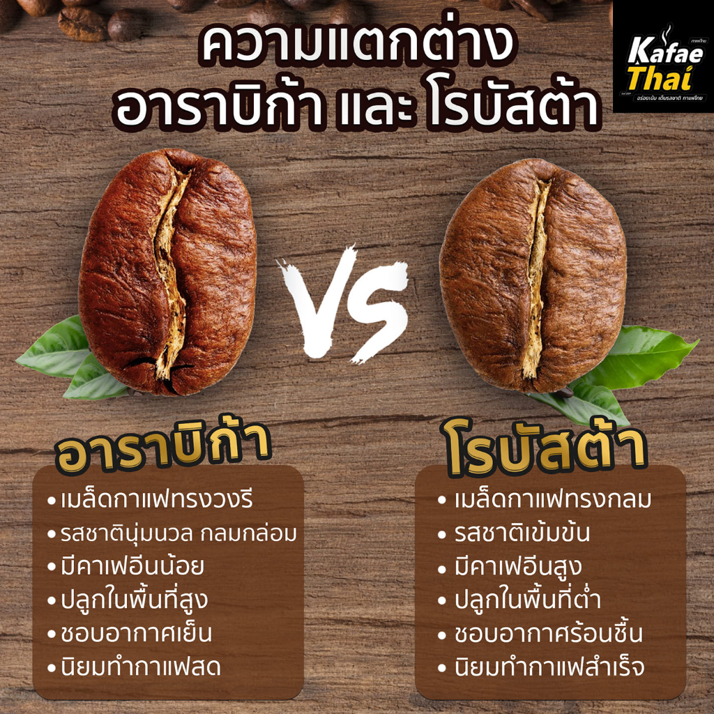 ... งที่ปลูก - อาราบิก้า ปลูกในที่สูงและอุณหภูมิเหมาะสมจึงจะได้กาแฟรสดีไม่เพี้ยนไปจากพันธุ์ดั้งเดิม โดยความสูงตั้งแต่ 1000 เมตร ขึ้นไปจากระดับน้ำทะเล และมีความลาดเอียงของพื้นที่ปลูกไม่เกิน 30% อุณหภูมิที่พอเหมาะจะอยู่ที่ 15 - 25 องศาเซลเซียส และมีความชื้นสัมพัทธ์มากกว่า 60% มีต้นสูงประมาณ 2.5-4.5 เมตร มีผลน้อยกว่าโรบัสต้า - โรบัสต้า สามารถปลูกได้ในพื้นที่ต่ำหรือประมาณ 200 - 800 เมตร อุณหภูมิที่พอเหมาะจะอยู่ที่ 24 - 36 องศา เซลเซียสหรือเหนือระดับน้ำทะเลในประเทศไทยปลูกมากในภาคใต้ เช่น จังหวัดชุมพร จังหวัดระนอง และจังหวัดสุราษฏร์ธานี มีต้นสูงประมาณ 4.5-6.5 เมตร มีลูกดกกว่าอาราบิก้า 👉รูปร่าง - อาราบิก้า : รูปทรงเป็นวงรี เส้นตรงกลางคด โรบัสต้า : รูปทรงเป็นวงกลม รอยบากเป็นเส้นตรง 👉รสชาติ - อาราบิก้า : เป็นกาแฟที่มีรสนุ่มลึก มีความหอมลงตัว กลมกล่อม มีกลิ่นที่หอมกว่าโรบัสต้า ฝาดน้อยกว่า มีคาเเฟอีนประมาณ 0.8-1.5% - โรบัสต้า : เป็นกาแฟที่มีรสเข้มข้น บอดี้หนักแน่น เเต่จะมีรสเปรี้ยวฝาด มีคาเเฟอีนประมาณ 1.7-3.5%