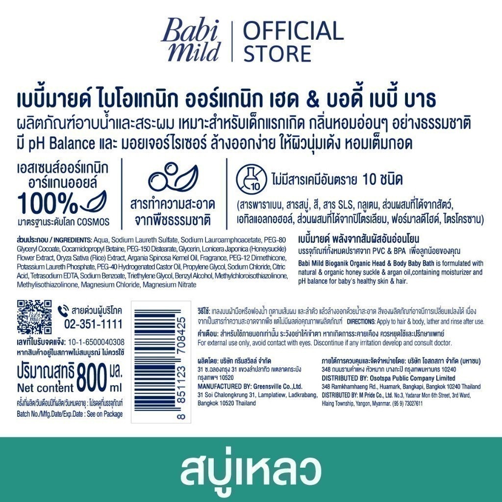 ... ก ได้แก่ เอสเซ้นส์ออร์แกนิกอาร์แกนออยล์ ผ่านการรับรองจากมาตรฐาน COSMOS และเอสเซ้นส์ออร์แกนิกฮันนี่ซัคเกิล ผ่านการรับรองจากมาตรฐาน USDA อุดมไปด้วยวิตามินอี และกรดไขมันจำเป็น ช่วยบำรุงผิว พร้อมมอยเจอร์ไรเซอร์ทำให้ผิวชุ่มชื่น สุขภาพดี pH Balance ช่วยรักษาสมดุลของน้ำหล่อเลี้ยงผิวตามธรรมชาติ ธรรมชาติดีที่สุดสำหรับลูกน้อย ผ่านการทดสอบไฮโปอัลเลอร์เจนิก ภายใต้การควบคุมของแพทย์ผิวหนัง ไม่ก่อให้เกิดการแพ้ เหมาะสำหรับผิวบอบบางของลูกน้อย - Harsh Chemical Free - Paraben Free - SLS Free - Alcohol Free - World-class organic essence certified สบู่เหลวเบบี้มายด์ สบู่เหลวยอดนิยมที่คุณแม่ทั่วไทยเลือกใช้ ขายดีอันดับหนึ่ง 3 ปีซ้อน การันตีด้วยรางวัล Best Head to Toe Wash จาก Amarin Baby & Kids Award 2020