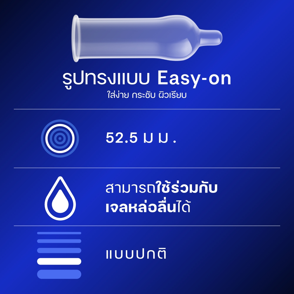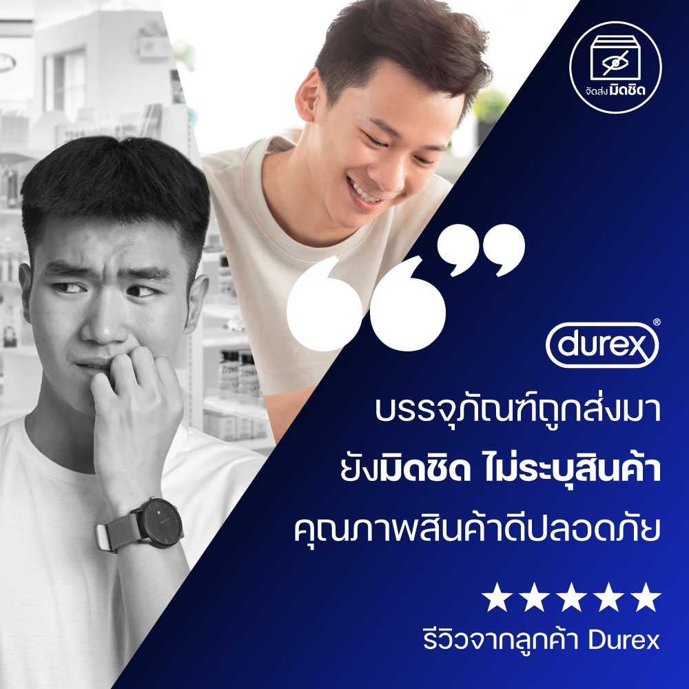 ... การใช้ถุงยางอนามัยดูเร็กซ์ ง่ายและรวดเร็ว 1. ถือด้านจุกตั้งขึ้น: ใช้มือที่สะอาดเปิด และถือด้านจุกให้ตั้งขึ้น บีบจุกเพื่อไม่ให้มีอากาศค้างอยู่ภายใน 2. บีบจุกถุงยางอนามัยไว้เพื่อไล่อากาศ แล้วค่อยๆรูดลง: วางถุงยางอนามัยลงบนอวัยวะเพศโดยที่ยังบีบจุกค้างไว้อยู่ ค่อยๆรูดลงไปจนสุดถึงโคน 3. จับให้เข้าที่: จับที่ส่วนโคนของถุงยางอนามัยไว้ในขณะดึงออก มัดบมแล้วค่อยทิ้ง ทุกชิ้นผ่านการตรวจสอบรอยรั่วด้วยเครื่องมืออิเล็กทรอนิกส์ การใช้ถุงยางอนามัยอย่างถูกวิธี จะป้องกันการตั้งครรภ์ และลดความเสี่ยงของการแพร่เชื้อ เอช ไอ วี และโรคติดต่อทางเพศสัมพันธ์ได้ อย่างไรก็ตาม ยังไม่มีวิธีคุมกำเนิดวิธีใดที่สามารถป้องกันการตั้งครรภ์ หรือเชื้อ เอช ไอ วี และโรคติดต่อทางเพศสัมพันธ์ได้ 100% คำเตือน: - ใช้ได้ครั้งเดียว - สวมถุงยางอนามัยทุกครั้งที่มีเพศสัมพันธ์ - ผลิตภัณฑ์นี้ทำจากน้ำยางธรรมชาติ อาจทำให้เกิดอาการแพ้ - ควรเก็บในที่แห้งและเย็น ไม่ให้ถูกแสงแดด และแสงฟลูออเรสเซนต์ ส่่วนประกอบ : น้ำยางธรรมชาติแท้ เลขที่จดแจ้ง 65-1-2-2-0001087 เก็บรักษาได้ 5 ปี นับจากวันที่ผลิต