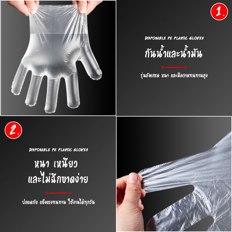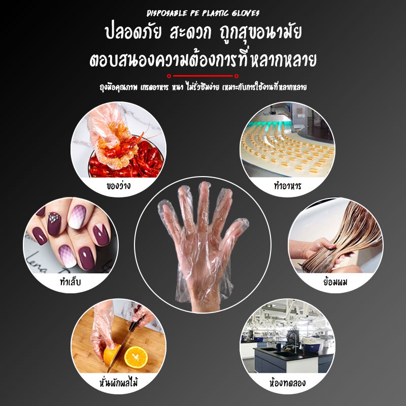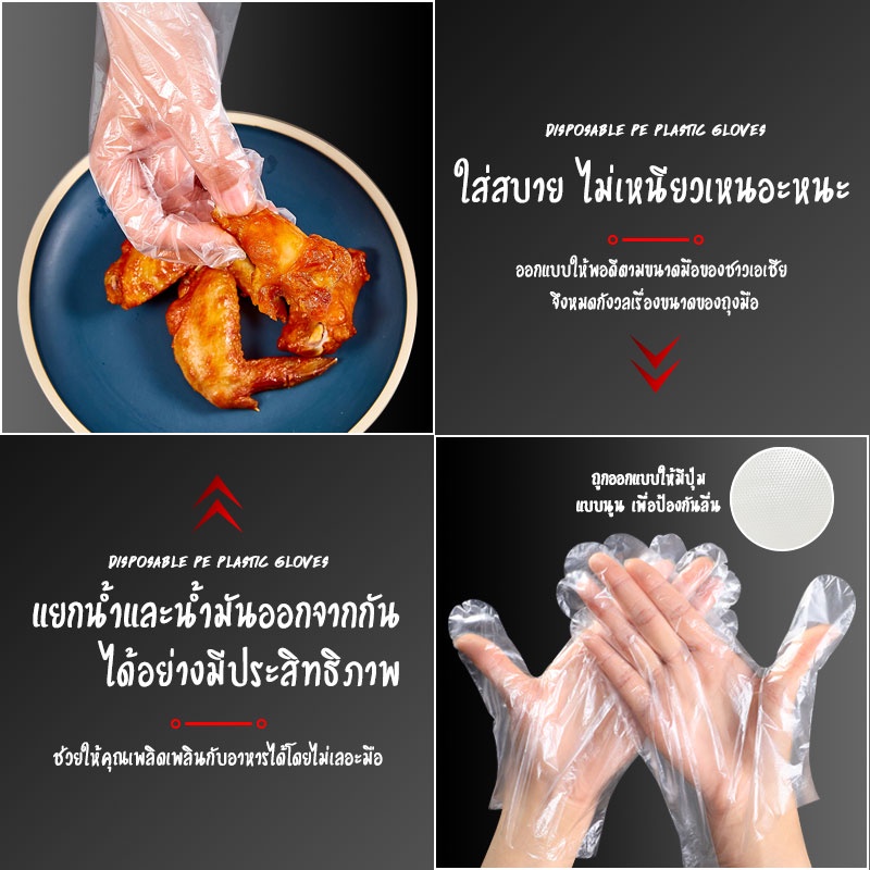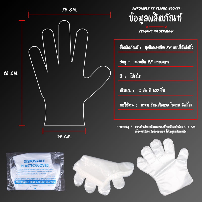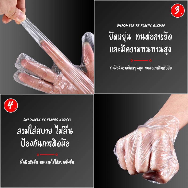 Product Description 📌ชื่อสินค้า: ถุงมือพลาสติกใส (Food Grade) 📌ของอยู่กรุงเทพพร้อมส่งทุกออเดอร์ 📌วัสดุ: PP Plastic 📌สี : แบบใส 📌ขนาด : ขนาด Freesize เด็ก-ผู้ใหญ่ ใส่ได้หมดค่ะ 📌จำนวน : แพคละ 100 ชิ้น Product Features 1. ใช้แล้วทิ้งเพื่อสุขอนามัยที่ดี คุณภาพดี เหนียวทน ผลิตด้วยเทคโนโลยีข
