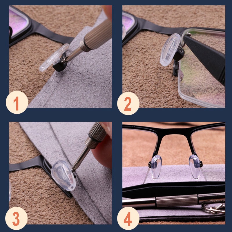 เ❣กี่ยวกับสินค้า 1. ทำจากวัสดุพีวีซีนุ่ม มันนุ่ม และสวมใส่สบาย กันลื่น และทนทาน 2. เหมาะสำหรับแว่นตาส่วนใหญ่ แว่นกันแดด แว่นอ่านหนังสือ ฯลฯ 3. แป้นรองจมูกควรเปลี่ยนสม่ำเสมอทุก 3-6 เดือน แพ็คเกจรวม -1x ไขควง 3in1 (ไขควงปากแบน, ไขควงปากแฉก) -1x คีมสำหรับคีบ -40 x น็อต และ สกรูสแตนเลส สำหรับแป