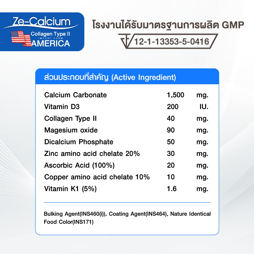 ... -Zinc Amino ควบคุมการรัดตัวของกล้ามเนื้อ -Magnesium ควบคุมการคลายตัวของกล้ามเนื้อ -Vitamin K1 บำรุงรักษาเนื้อเยื่อ -Copper สมานแผล วิธีรับประทาน เด็กอายุ 4 ขวบ: วันละ 1 เม็ด ก่อนอาหาร 5-10 นาที ผู้ใหญ่: วันละ 2 เม็ด เช้า-เย็น ก่อนอาหาร 5-10 นาที การดูแลสุขภาพกระดูกและข้อต่อเป็นเรื่องสำคัญ ควรเริ่มตั้งแต่วันนี้ 🍃ส่วนประกอบที่สำคัญ🍃 Calcium Carbonate 1,500 mg. Vitamin D3 200 lU. Collagen Typ ll 40 mg. Magesium oxide 90 mg. Dicalcium Phosphate 50 mg. Zinc amino acid chelate 20% 30 mg. Ascorbic Acid (100%) 20 mg. Copper amino acid chelate 10% 10 mg. Vitamin K1 (5%) 1.6 mg. โรงงานได้รับมาตรฐานการผลิต GMP อย.เลขที่ 12-1-13353-5-0416 การขนส่ง • ส่งสินค้าทุกวันจันทร์ - เสาร์ ตัดรอบทุก 10:00 น. (บริษัทหยุดวันอาทิตย์-วันนักขัตฤกษ์-ขออภัยในความไม่สะดวก) • กทม. และปริมณฑล ของถึงภายใน 1-2 วัน • ต่างจังหวัด ของถึงภายใน 2-3 วัน • ปล. สินค้าอาจเกิดการล่าช้าจากการขนส่ง สามารถแจ้งทางร้านได้ทันที เงื่อนไขการเคลมสินค้า • ทุกครั้งที่รับสินค้า "รบกวนถ่ายวีดีโอตอนแกะพัสดุ" เพื่อเป็นหลักฐานยืนยัน • ว่าคุณลูกค้าได้รับสินค้าไม่ครบ หรือ สินค้าเสียหายก่อนแกะกล่อง • หากไม่มีวีดีโอดังกล่าว ทางร้านจะไม่รับการเคลมทุกกรณี