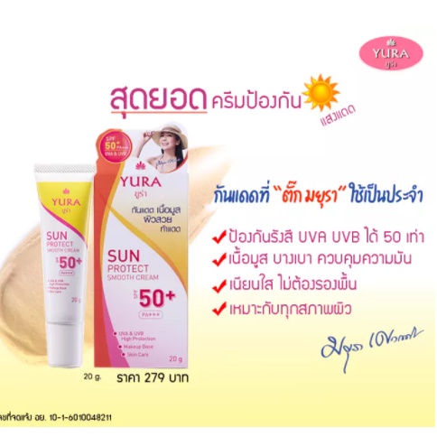 โปรซื้อ กันแดด ฟรี สบู่ Yura Sun Protect Smooth ยูร่า ซัน โพรเทค สมูท ครีมกันแดด SPF50+ PA+++ 20g.