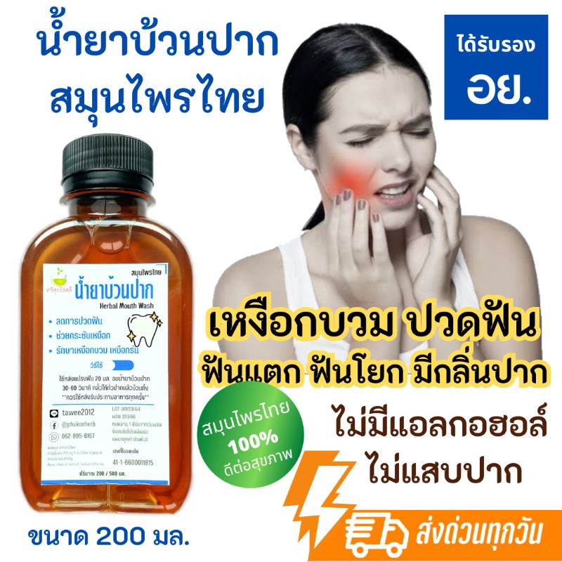 สมุนไพรบ้วนปาก ลดเหงือกบวม ตราทวีสุขโอสถ ได้รับรองมาตรฐาน อย. เลขที่ใบจดแจ้ง 41-1-6600011815 🌿สรรพคุณ🌿 ช่วยลดการปวดฟัน จากฟันหัก ฟันแตก แมงกินฟัน รำมะนาด หรือโรคปริทันต์ ไม่มีแอลกอฮอล์ ไม่แสบปาก สมุนไพร 100% ตัวยาสำคัญ กานพลู ข่อย ดีเกลือ ขนาดเล็ก 200 มล. ใช้พกพา ขนาดใหญ่สุดคุ้ม 50