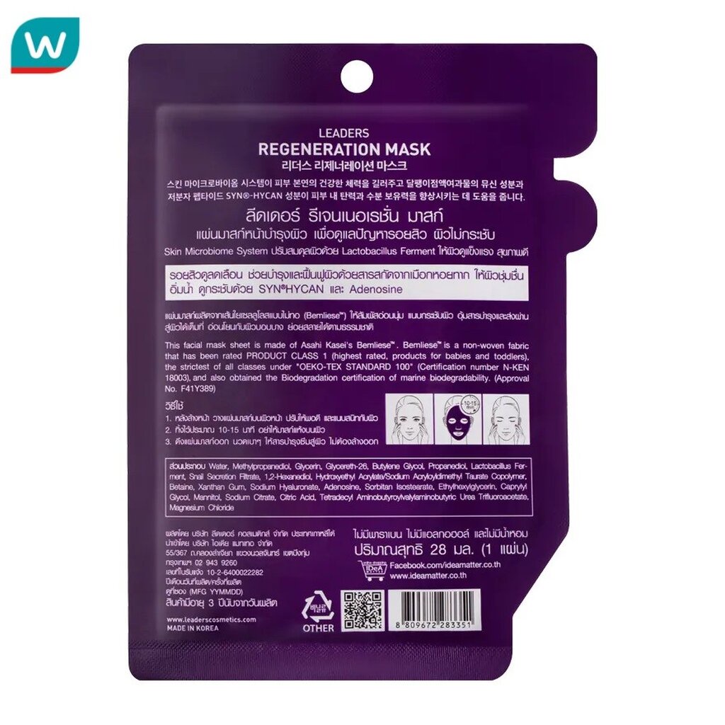 รายละเอียดสินค้า ลีดเดอร์ รีเจนเนอเรชั่น มาสก์ แผ่นมาสก์หน้าบำรุงผิว เพื่อดูแลปัญหารอยสิว ผิวไม่กระชับ Skin Microbiome System ปรับสมดุลผิวด้วย Lactobacillus Ferment ให้ผิวดูแข็งแรง สุขภาพดี รอยสิวดูลดเลือน ช่วยบำรุงและฟื้นฟูผิวด้วยสารสกัดจากเมือกหอยทาก ให้ผิวชุ่มชื่น อิ่มน้ำ ดูกระชับด้วย SYN HYCA