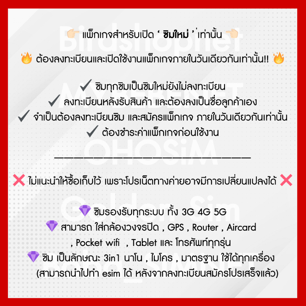 ... ตัดรอบจัดส่งสินค้า 11.00 ของทุกวัน (ส่งของทุกวัน ) ————————————————————————————— 👉🏻 กรุณาอ่านก่อนสั่ง ((สำคัญมาก)) 👈🏻 ‼️ สมัครโปร ภายใน 31 ต.ค. 2567 เท่านั้น ‼️ (หากได้รับสินค้าเกินวัน ทักแชททางร้านเพื่ออัพเดตโปร) 🚫 หากไม่เปิดใช้งาน ซิมจะหมดอายุ 31 ธ.ค. 2567 🚫 ☑️ใบคู่มือที่แนบไปพร้อมสินค้า จะบอกขั้นตอนการลงทะเบียนและสมัครโปร☑️ 🔥 ต้องลงทะเบียนและเปิดใช้งานแพคเกจภายในวันเดียวกันเท่านั้น!! 🔥 🔸 ซิมทุกซิมเป็นซิมใหม่ยังไม่ลงทะเบียน 🔸 ลงทะเบียนหลังรับสินค้าเท่านั้น 🔸 จำเป็นต้องลงทะเบียนซิม และสมัครแพ็กเกจ ภายในวันเดียวกันเท่านั้น 🔸 ชำระค่าแพ็กเกจก่อนใช้งาน (หากสั่งสินค้าชื่อ ฟรีเดือนแรก ไม่ต้องชำระเพิ่ม) 🔸 ไม่เกิน 1 ชม. ทางร้านจะเปิดซิมในระบบให้ ————————————————————————————— ✅ จำเป็นต้องลงทะเบียนและเปิดใช้งาน ภายในวันเดียวกันเท่านั้น!! ❌❌ ไม่แนะนำให้ซื้อเก็บไว้ เพราะโปรเน็ตทางค่ายอาจมีการเปลี่ยนแปลงได้ ❌❌ ————————————————————————————— • แพ็กเกจตามที่โฆษณา อาจมีการปรับเปลี่ยนตามที่บริษัทกำหนด • ⚠️ แนะนำสอบถามแพ็กเกจอัพเดตล่าสุด ณ วันลงทะเบียน ⚠️ 🌐 เน็ตเร็ว 15 Mbps (30+10 = 40GB) + โทรทุกค่าย 📞 โทรฟรีทุกเครือข่าย (ครั้งละ 15 นาที) 💰 200 บาท / 30 วัน (👆🏻เมื่อใช้งานครบกำหนด จะใช้ได้ต่อที่ความเร็ว 384 Kbps ไม่อั้นจนครบ 30 วัน ) เดือนที่ 2-6 แถมเน็ตเพิ่มอีก 20GB รวมได้เน็ต 60GB 🌐 เน็ตเร็ว 15 Mbps (55+10 = 65GB) + โทรทุกค่าย 📞 โทรฟรีทุกเครือข่าย (ครั้งละ 15 นาที) 💰 250 บาท / 30 วัน (👆🏻เมื่อใช้งานครบกำหนด จะใช้ได้ต่อที่ความเร็ว 384 Kbps ไม่อั้นจนครบ 30 วัน ) เดือนที่ 2-6 แถมเน็ตเพิ่มอีก 20GB รวมได้เน็ต 75GB 🌐 เน็ตเร็ว 15 Mbps (80+20 = 100GB) + โทรทุกค่าย 📞 โทรฟรีทุกเครือข่าย (ครั้งละ 15 นาที) 💰 300 บาท / 30 วัน (👆🏻เมื่อใช้งานครบกำหนด จะใช้ได้ต่อที่ความเร็ว 1 Mbps ไม่อั้นจนครบ 30 วัน ) เดือนที่ 2-6 แถมเน็ตเพิ่มอีก 20GB รวมได้เน็ต 120GB 🌐 เน็ตเร็ว 20 Mbps (เน็ตอย่างเดียว 60+20 = 80GB) 💰 300 บาท / 30 วัน (👆🏻เมื่อใช้งานครบกำหนด จะใช้ได้ต่อที่ความเร็ว 1 Mbps ไม่อั้นจนครบ 30 วัน ) เดือนที่ 2-6 แถมเน็ตเพิ่มอีก 20GB รวมได้เน็ต 100GB 🌐 เน็ตเร็ว 20 Mbps (60+20 = 80GB) + โทรทุกค่าย 📞 โทรฟรีทุกเครือข่าย (ครั้งละ 15 นาที) 💰 359 บาท / 30 วัน (👆🏻เมื่อใช้งานครบกำหนด จะใช้ได้ต่อที่ความเร็ว 1 Mbps ไม่อั้นจนครบ 30 วัน ) เดือนที่ 2-6 แถมเน็ตเพิ่มอีก 20GB รวมได้เน็ต 100GB 🌐 เน็ตเต็มสปีด วิ่งสูงสุด 1,000 Mbps (เน็ตอย่างเดียว 100+20 = 120GB) 💰 399 บาท / 30 วัน (👆🏻เมื่อใช้งานครบกำหนด จะใช้ได้ต่อที่ความเร็ว 1 Mbps ไม่อั้นจนครบ 30 วัน ) เดือนที่ 2-6 แถมเน็ตเพิ่มอีก 20GB รวมได้เน็ต 140GB 🌐 เน็ต 10 Mbps ไม่จำกัด GB (เฉพาะ Tiktok) ⚫️ 🌐 แอพอื่นๆ เล่นได้ 20GB จากนั้นใช้ต่อได้ที่ 384 Kbps 📞 โทรฟรีทุกเครือข่าย (ครั้ง