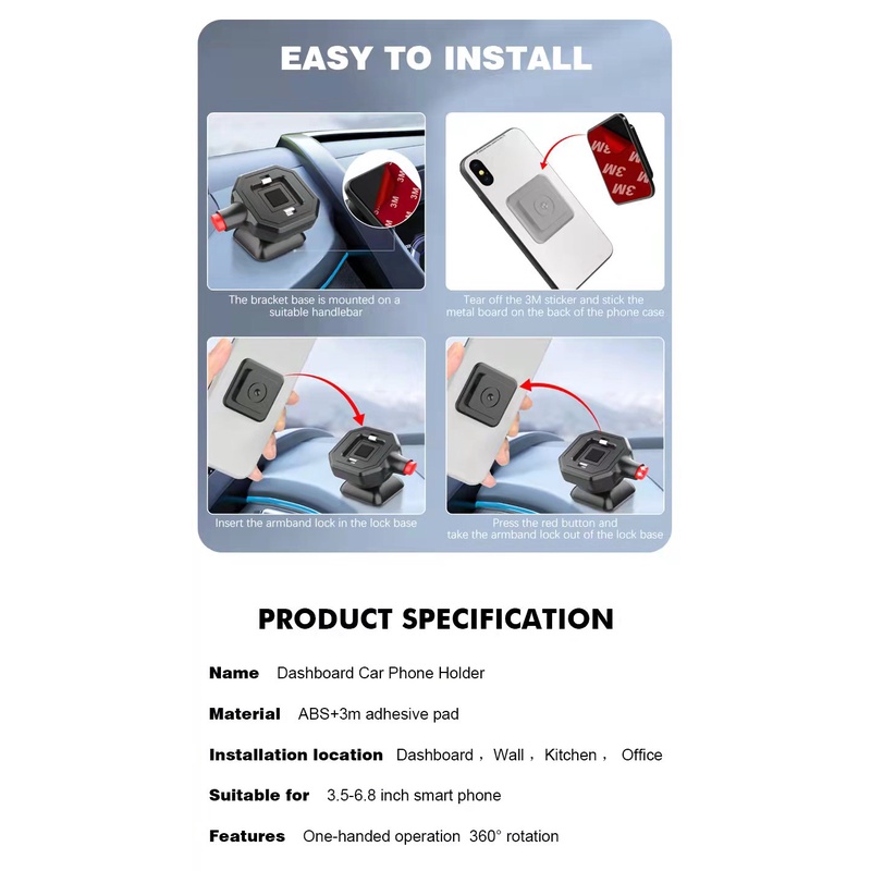 คุณสมบัติของผลิตภัณฑ์ ชื่อ-ที่วางโทรศัพท์ในรถยนต์แดชบอร์ด วัสดุ -ABS+แผ่นกาว3ม. สถานที่ติดตั้ง -แดชบอร์ด, ผนัง, ห้องครัว, สำนักงาน เหมาะสำหรับ-3.5-6. สมาร์ทโฟน 8 นิ้ว คุณสมบัติ -หมุนด้วยมือเดียวได้ 360° PRODUCT SPECIFICATION Name -Dashboard Car Phone Holder Material -ABS+3m adhesive pad