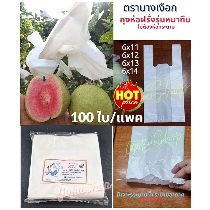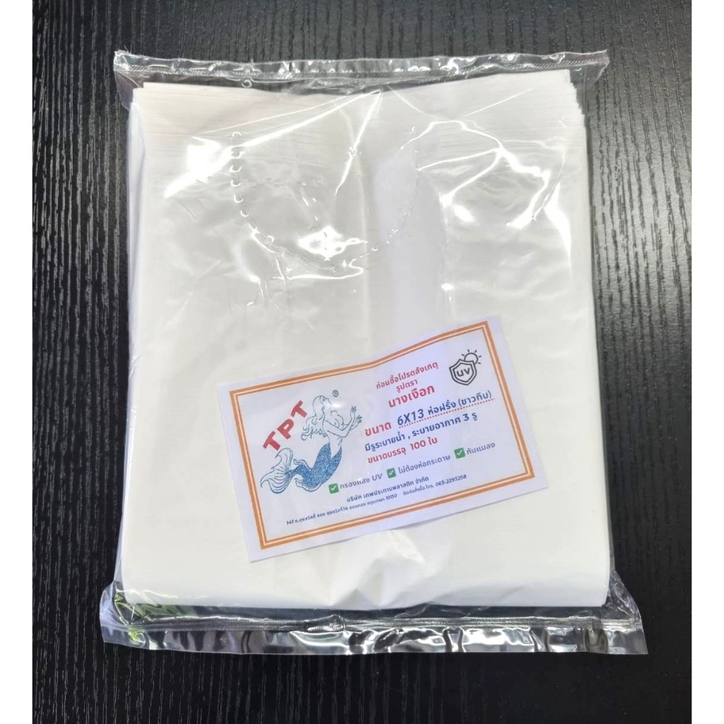 ถุงห่อฝรั่ง ห่อผลไม้ ขาวขุ่น รุ่นหนาทึบ ตรานางเงือก ขนาด 6x11 นิ้ว ,6x12 นิ้ว ,6x13 นิ้ว, 6x14 นิ้ว มีเจาะรู ระบายน้ำ ระบายอากาศ 3 รู (เป็นการเว้นซีล 3 รู ก้นถุง มองด้วยตา ไม่เห็นเป็นรู ลูกค้าใส่น้ำในถุงเช็คได้ค่ะ) 🚩หนาทึบ ไม่ต้องห่อกระดาษ 🚩 คุ้มสุดสุด ขนาด 6*11 นิ้ว ขนาด 6