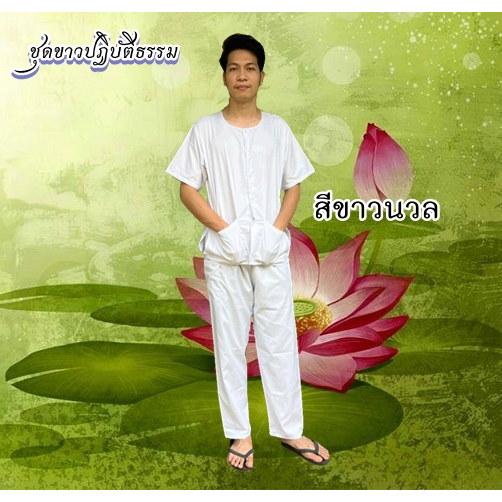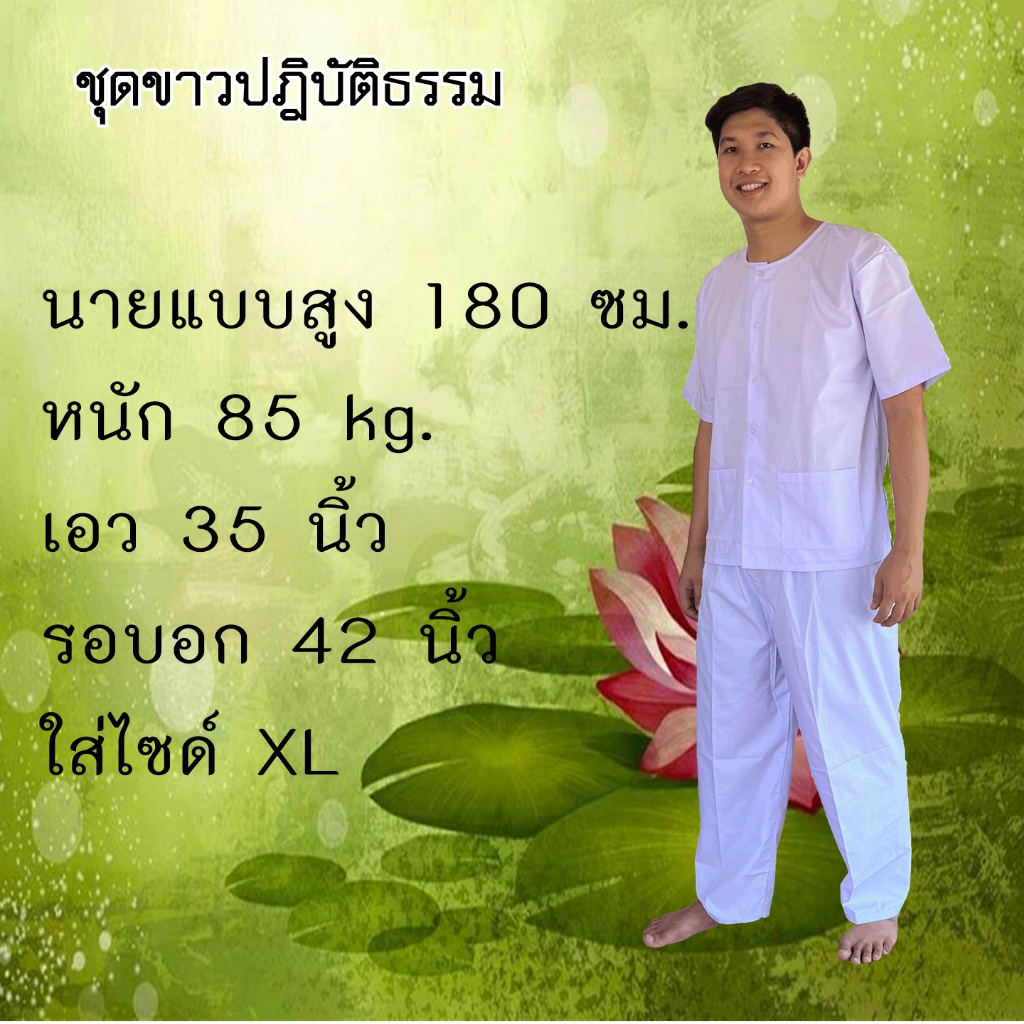 ชุดขาวปฎิบัติธรรมสีขาว เสื้อแขนสั้น - s รอบอกเสื้อ 40-42 นิ้ว - m รอบอกเสื้อ 42-44 นิ้ว - L รอบอกเสื้อ 44-46 นิ้ว - xl รอบอกเสื้อ 46-48 นิ้ว - xxl รอบอกเสื้อ 48-50 นิ้ว กางเกงเอวยางยืด S ก่อนยืด 19 นิ้ว, ยืดได้ 36 นิ้ว ,เป้า 13 นิ้ว ,สะโพก 46 นิ้ว , ยาว 34 นิ้ว M ก่อนยืด 19 นิ้ว ,ยืด