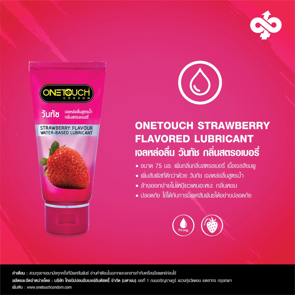 เจลหล่อลื่น Onetouch กลิ่นสตรอเบอร์รี่ ขนาด 75 มล. กลิ่นสตรอเบอร์รี่ เนื้อเจลสีชมพู ล้างออกง่ายไม่เหนียวเหนอะหนะ กลิ่นหอม ปลอดภัย ใช้ได้กับการมีเพศสัมพันธ์ได้อย่างปลอดภัย เพิ่มสัมผัสที่ดีกว่าด้วย วันทัช เจลหล่อลื่นสูตรน้ำ