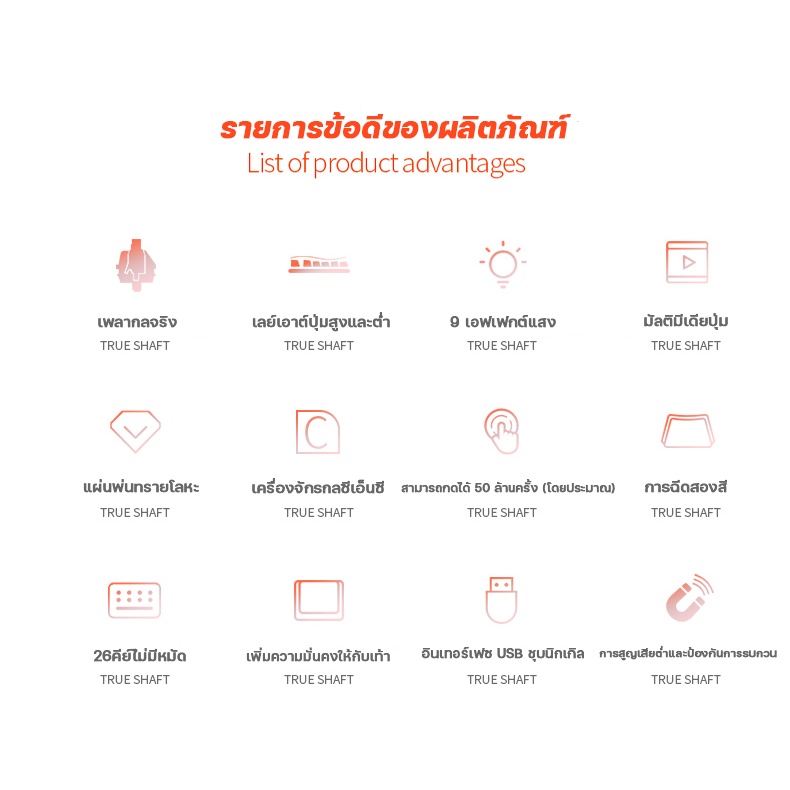(ฟรีสติ๊กเกอร์ภาษาไทย!) จำนวนปุ่ม: 87 ปุ่ม แป้นพิมพ์เครื่องกล: สวิตช์สีน้ำเงิน สไตล์แบ็คไลท์: หกสีผสมสี อินเทอร์เฟซผลิตภัณฑ์: USB ชุบนิกเกิล จังหวะสำคัญ: 2.0±0.6mm ปุ่มขัดแย้ง: 26 ปุ่มโดยไม่มีการชนกัน วัสดุแผง: แผงโลหะพ่นทราย อายุการใช้งาน: ประมาณ 50 ล้านครั้ง