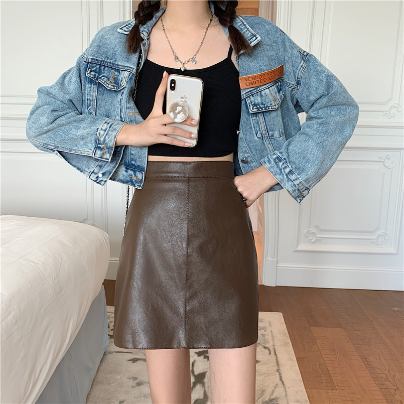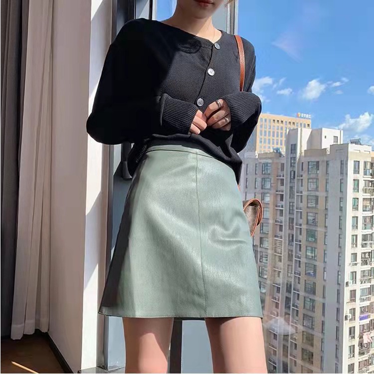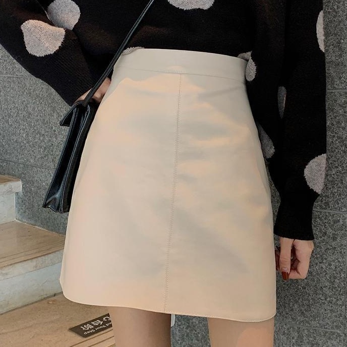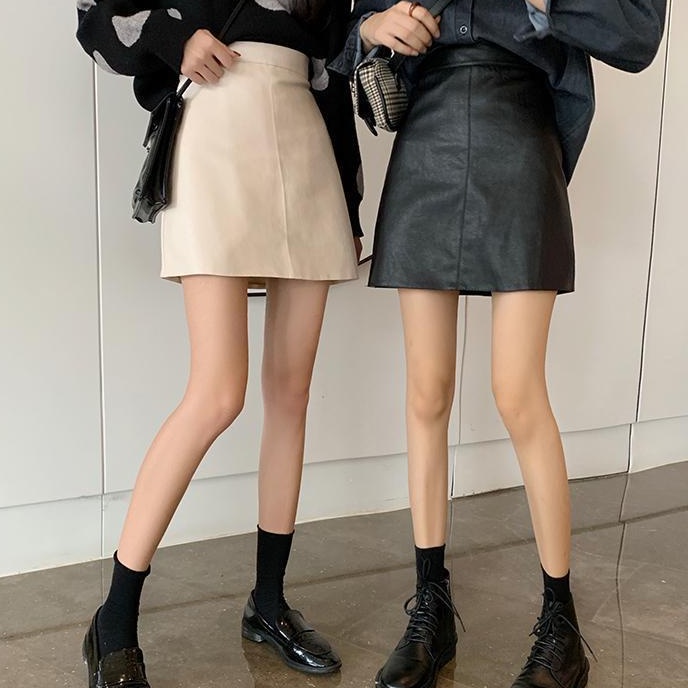 ✨ กระโปรงหนัง PU ฤดูใบไม้ผลิและฤดูใบไม้ร่วง แฟชั่นใหม่ 👗 กระโปรงหนังสั้นสั้นเอวสูง ทรงเอบาง all-match