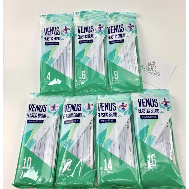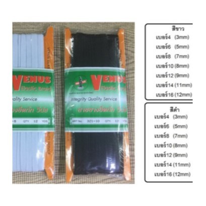 ยางยืด วีนัส สีขาว สีดำ 1 พับ มี 12 หลา เบอร์ 4 = 3 mm เบอร์ 6 = 5 mm เบอร์ 8 = 7 mm เบอร์ 10 = 8 mm เบอร์ 12 = 9 mm เบอร์ 14 = 11 mm เบอร์ 16 = 12 mm