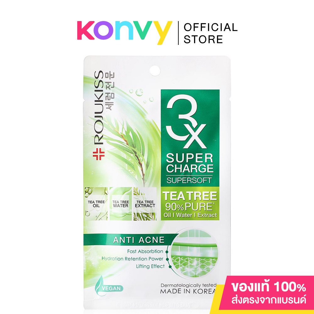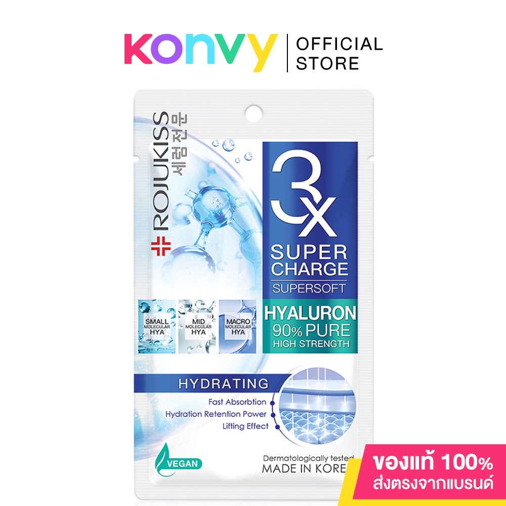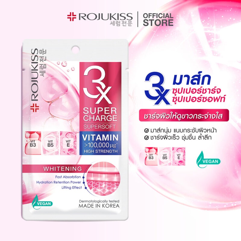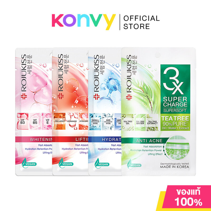 ... แบบพิเศษ ด้วยลักษณะของเนื้อมาสก์จึงสามารถยึดเกาะกับใบหน้าและโปร่งแสงเมื่อเทียบกับแผ่นมาสก์ปกติ มีความกระชับแนบสนิทไปกับรูปหน้า จึงช่วยส่งผ่านสารบำรุงอย่างล้ำลึก เข้าสู่ผิวได้อย่างมีประสิทธิภาพ •Rojukiss Supercharge Supersoft Lifting Mask 25ml ยกระดับแผ่นมาสก์บำรุงผิว ออกแบบเพื่อการฟื้นบำรุงผิวขั้นสุด ดุจการชาร์จความชุ่มชื้น ให้ผิวนุ่มเด้ง พร้อมบูสต์ผิวด้วยคอลลาเจน 3X ที่ช่วยดูแลปัญหาผิวที่แห้ง เริ่มมีริ้วรอย และความย่อนคล้อยแก้ยาก ช่วยให้ผิวดูกระชับ เนียนเรียบ และยืดหยุ่น พร้อมแผ่นมาสก์ PT CELL ที่ออกมาแบบพิเศษ ด้วยลักษณะของเนื้อมาสก์จึงสามารถยึดเกาะกับใบหน้าและโปร่งแสงเมื่อเทียบกับแผ่นมาสก์ปกติ มีความกระชับแนบสนิทไปกับรูปหน้า จึงช่วยส่งผ่านสารบำรุงอย่างล้ำลึก เข้าสู่ผิวได้อย่างมีประสิทธิภาพ • Rojukiss Supercharge Supersoft Hydrating Mask 25ml ยกระดับแผ่นมาสก์บำรุงผิว ออกแบบเพื่อการฟื้นบำรุงผิวขั้นสุด ดุจการชาร์จความชุ่มชื้น ให้ผิวนุ่มเด้ง พร้อมบูสต์ผิวด้วยไฮยาลูรอน 3X ที่ช่วยดูแลปัญหาผิวแห้งกร้าน ขาดน้ำแก้ยาก ช่วยคืนความชุ่มชื้นให้ผิวอย่างต่อเนื่อง ให้ผิวดูอิ่มฟู นุ่มเด้ง พร้อมแผ่นมาสก์ PT CELL ที่ออกมาแบบพิเศษ ด้วยลักษณะของเนื้อมาสก์จึงสามารถยึดเกาะกับใบหน้าและโปร่งแสงเมื่อเทียบกับแผ่นมาสก์ปกติ มีความกระชับแนบสนิทไปกับรูปหน้า จึงช่วยส่งผ่านสารบำรุงอย่างล้ำลึก เข้าสู่ผิวได้อย่างมีประสิทธิภาพ • Rojukiss Supercharge Supersoft Anti Acne Mask 25ml ยกระดับแผ่นมาสก์บำรุงผิว ออกแบบเพื่อการฟื้นบำรุงผิวขั้นสุด ดุจการชาร์จความชุ่มชื้น ให้ผิวนุ่มเด้ง พร้อมบูสต์ผิวด้วยที ทรี 3X ที่ช่วยดูแลปัญหาสิว ความมันแก้ยาก ช่วยลดความมันส่วนเกินบนใบหน้า ลดโอกาสการเกินสิวใหม่ พร้อมแผ่นมาสก์ PT CELL ที่ออกมาแบบพิเศษ ด้วยลักษณะของเนื้อมาสก์จึงสามารถยึดเกาะกับใบหน้าและโปร่งแสงเมื่อเทียบกับแผ่นมาสก์ปกติ มีความกระชับแนบสนิทไปกับรูปหน้า จึงช่วยส่งผ่านสารบำรุงอย่างล้ำลึก เข้าสู่ผิวได้อย่างมีประสิทธิภาพ วิธีใช้: หลังทำความสะอาดผิวหน้า วางแผ่นมาสก์บนใบหน้า ทิ้งไว้ 10-20 นาที จากนั้นดึงแผ่นมาสก์ออกและนวดเบาๆ เพื่อให้สารสำคัญซึมสู่ผิวอย่างเต็มประสิทธิภาพ
