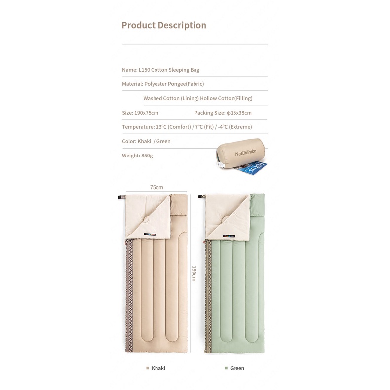 ... ์ Pongee (ผ้า) ซักผ้าฝ้าย (ซับใน) ฮอลโลว์คอตตอน(ไส้) สี: สีกากี / เขียว ใช้: ท่องเที่ยว / พักผ่อน / แคมป์ปิ้ง / นอนพักกลางวัน / สำนักงาน Brand Name: Naturehike Comfortable Temperature Scale: [15℃~5℃] Single/Double Sleeping Bag: Splicing Single Sleeping Bag Applicable People: Adult Length: Standard (Suitable for 1.8 m Height and Below) Origin: CN(Origin) Season: Spring & Autumn Season: Winter Size: 190x75cm Model Number: L150 Type: 3 Season Sleeping Bag Temperature Scale Category: Spring and Autumn Sleeping Bag is_customized: Yes Category: Cotton Sleeping Bag Filling: Cotton Fabric: Polyester Pongee(Fabric) Style: Envelope Type Model NO: NH20MSD05 Name: L150 Cotton Sleeping Bag Weight: About:1026g Size: 190x75cm Packing Size: 15x38cm Comfort Temperature: 13℃ Fit Temperature: 7℃ Extreme Temperature: -4℃ Material: Polyester Pongee(Fabric)