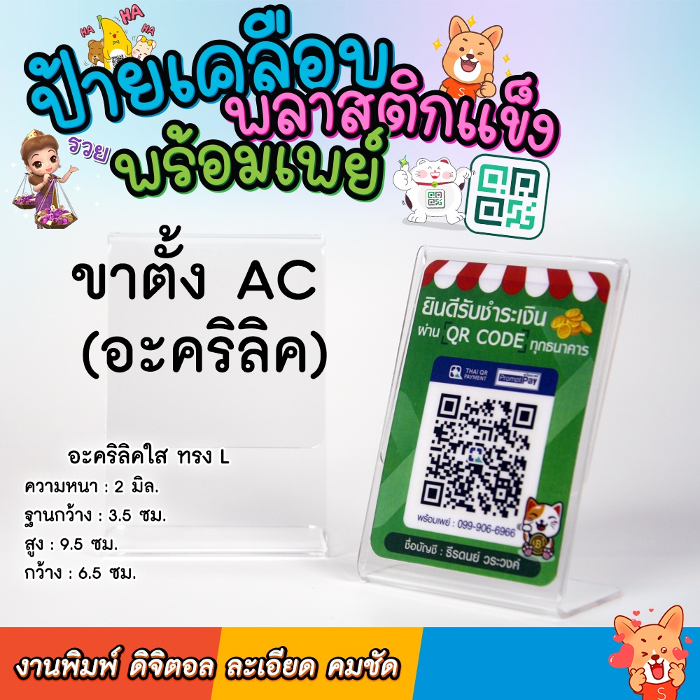 ... ได้เลย - แจ้งรายละเอียดเพิ่มเติมที่อยากให้ใส่ในป้าย เช่น ชื่อร้าน เบอร์โทร เป็นต้น 🔶ตัวเลือกสินค้า 🔶 👉[ A4 ] 21 x 29 ซม. = จะได้รับป้ายเคลือบ ขนาด A4 21 x 29 ซม. (เฉพาะป้ายเคลือบ) 👉[ A5 ] 15 x 21 ซม. = จะได้รับป้ายเคลือบ ขนาด A5 15 x 21 ซม. (เฉพาะป้ายเคลือบ) 👉[ A6 ] 11 x 15 ซม. = จะได้รับป้ายเคลือบ ขนาด A6 11 x 15 ซม. (เฉพาะป้ายเคลือบ) 👉[ A6 ] + ขาอะคริลิค = จะได้รับป้ายเคลือบ ขนาด A6 11x15 ซม. พร้อมขาตั้งอะคริลิคทรง L ขนาด A6 แนวตั้ง 👉[ MINI ] + ขาอะคริลิ = จะได้รับป้ายเคลือบ ขนาด 6.5x9 ซม. พร้อมขาตั้งอะคริลิคทรง L ขนาด 6.5x9 ซม. แนวตั้ง 👉[ MINI ] + ขาพลาสติก = จะได้รับป้ายเคลือบ ขนาด 6.5x9 ซม. พร้อมขาตั้งพลาสติกทรง พิรามิด ขนาด 5.5x5.5 ซม. แนวตั้ง 🔷ขนาดสินค้า🔷 วัดขนาดรวมพลาสติกเคลือบ 👉[ A4 ] 21.6 x 30.6 ซม. 👉[ A5 ] 16 x 22 ซม. 👉[ A6 ] 11 x 15.4 ซม. 👉[ MINI ] 6.5x9.5 ซม. วัดเฉพาะขนาดกระดาษ 👉[ A4 ] 20.24 x 29.4 ซม. 👉[ A5 ] 14.5 x 20.6 ซม. 👉[ A6 ] 10 x 14.4 ซม. 👉[ MINI ] 6 x 8.64 ซม. หากลูกค้าต้องการนำไปใส่ขาตั้งเอง กรุณาแจ้งขนาดขาตั้งที่ใกล้เคียง เพื่อให้ทางร้านปรับขนาดป้ายให้ได้นิดหน่อยค่ะ ตัวเลือกขาตั้ง AC คือ อะคริลิค ตัวอย่างอะคริลิค https://shope.ee/1VKvquD3wG ป้ายสแกนชำระเงินผ่าน QR Code (เคลือบพลาสติก) เหมาะกับร้านค้า (ส่งรูป QR Code ทาง Chat) ใช้กับที่หนีบตั้งหน้าร้าน หน้าถาดขนมได้ หรือวางบนถาดเลยก็ได้ ส่ง QR โค๊ดและแจ้งรายละเอียดทางแชท 🔸งานพิมพ์หน้าเดียว บนกระดาษอาร์ตมันอย่างดี หนา 216 แกรม 🔸พลาสติกใสเคลือบแข็งความหนา 125 ไมครอน แข็งแรงทนทาน กันน้ำ💦 ** ขายเฉพาะงานพิมพ์สำเร็จ ไม่ได้ให้รูป หรือไฟล์ ใดๆ สามารถให้ได้เฉพาะรูปติดลายน้ำเท่านั้น ** 🔴🔴 อย่าลืมส่งรูปคิวอา ที่จะให้ใส่ในป้าย ด้วยนะจ๊าาา 🔴🔴 🔴🔴 อย่าลืมส่งรูปคิวอา ที่จะให้ใส่ในป้าย ด้วยนะจ๊าาา 🔴🔴 วิธีการสั่งซื้อ - เพื่อป้องกันการลืมส่งรูปคิวอาร์ ลูกค้าควรส่งรูปคิวอาร์ ก่อนกดสั่งได้ค่ะ - แจ้งชื่อ บช. และหากต้องการใส่เลข บช. แบบเต็ม สามารถแจ้งเลข บช. ได้เลย - แจ้งรายละเอียดเพิ่มเติม เช่น ชื่อร้าน เบอร์โทร เป็นต้น 🔶 หากลูกค้าไม่ส่งรูปคิวอาร์ ภายใน 1 วันตัดรอบ ทางร้านจำเป็นต้องส่งสินค้า ตามกำหนดเวลาของแอปฯ แบบไม่ใส่คิวอา และข้อมูลนะจ๊ะ 🔶 ปล. เมื่อได้รับสินค้าแล้ว กรุณาตรวจสอบรายละเอียดความถูกต้องของข้อมูลบนป้าย และทดสอบคิวอาร์ ด้วยการลองแสกน ก่อนใช้งานจริง เพื่อป้องกันความเสียหายที่จะเกิดขึ้น ================================================ ออกแบบสติ๊กเกอร์ ฉลากสินค้า พิมพ์พร้อมไดคัท 👉 ราคาถูก ไม่มีขั้นต่ำ 👉 งานพิมพ์คุณภาพ ละเอียด คมชัดสูง 👉 หมึกพิมพ์ กันแดด กันน้ำ 100% 👉 สติ๊กเกอร์ PP ขาวมัน ขาวด้าน ใสมัน 🌺 จำนวนดวงต่อแผ่น ได้เยอะสุด 🌺 Sticker PP แช่น้ำ แช่ตู้เย็นได้ ไม่หลุดลอก . 👉 กาวติดแน่น ไม่หลุดลอก ไม่เผยอ . 👉 ทนค