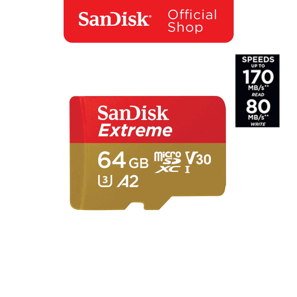SanDisk EXTREME microSDXC UHS-I A2 64GB (SDSQXAH-064G-GN6MN) reads 170MB/s writes 80MB/s - สินค้าเป็นของแท้ 100% รับประกันตลอดอายุการใช้งานโดยศูนย์บริการซินเน็คประเทศไทย - กรุณาสอบถามรายละเอียดสินค้าก่อนทำการสั่งซื้อ หากซื้อสินค้าผิดรุ่นทางร้านขออนุญาตไม่รับเปลี่ยนหรือคืนสินค้าค่ะ *** กรณีต
