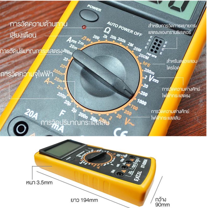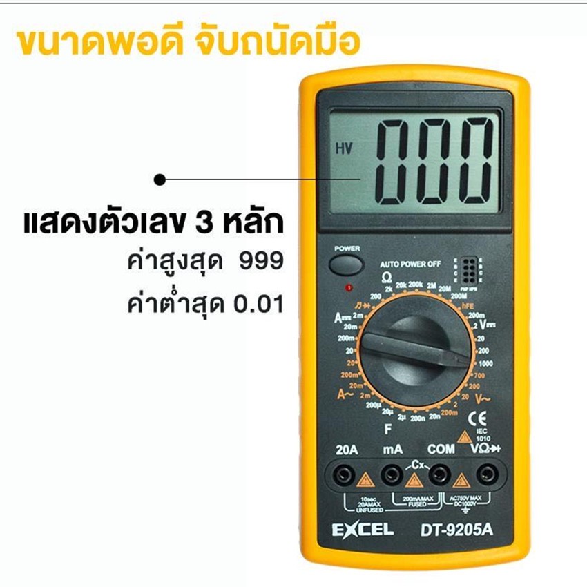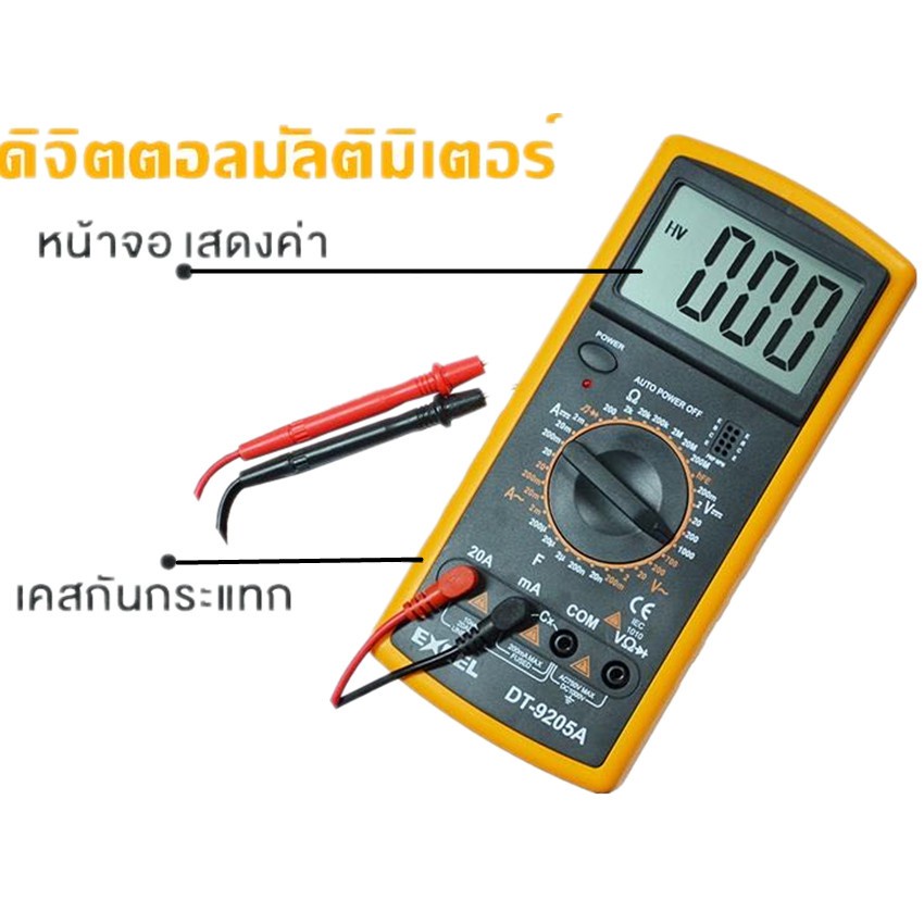 ... มต้านทาน วัดได้สูงสุด: 20 เมกะโอห์ม ย่านวัดแรงดันDC: 200mV/2V/20V/200V/1000V ย่านวัดแรงดันAC: 2V/20V/200V/700V ย่านวัดกระแสDC: 20u/2m/200m/20A ย่านวัดกระแสAC: 2m/200m/20A ย่านวัดความต้านทาน: 200/2k/20k/200k/2M/20M ย่านวัดคาปาซิสเตอร์: 20n/2u/20u/200u Automatic polarity indication ย่านวัดไดโอดและทรานซิสเตอร์ (hFE) test วัดหาค่าอัตราการขยายกระแสตรงของทรานซิสเตอร์ได้ คุณภาพดี ราคาถูก วัด Capacitor ได้ด้วย ราคาสุดคุ้ม ตัวเดียวเอาอยู่ ไม่ว่าจะเป็นไฟบ้าน ไฟโรงงาน หรืองานซ่อมอุปกรณ์อิเล็กทรอนิกส์ มัลติมิเตอร์ EXCEL DT-9205A เครื่องวัดกระแสไฟฟ้า ก็สามารถใช้งานได้ดี