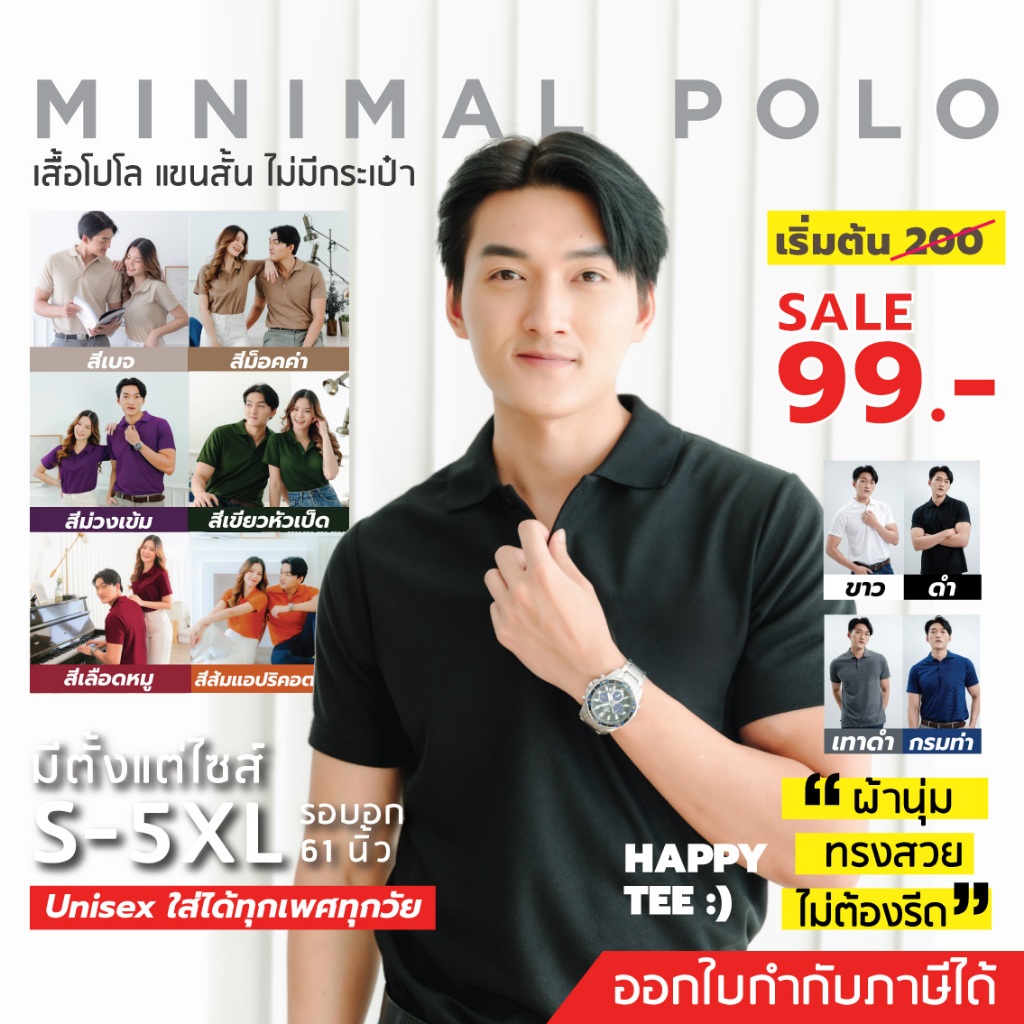 HAPPY TEE ท้าให้ลอง!! เสื้อโปโล ทรงสวย "ไม่มีกระเป๋า" สีสวย ตรงปก ผ้านุ่มไม่ต้องรีด มีถึงรอบอก 61"
