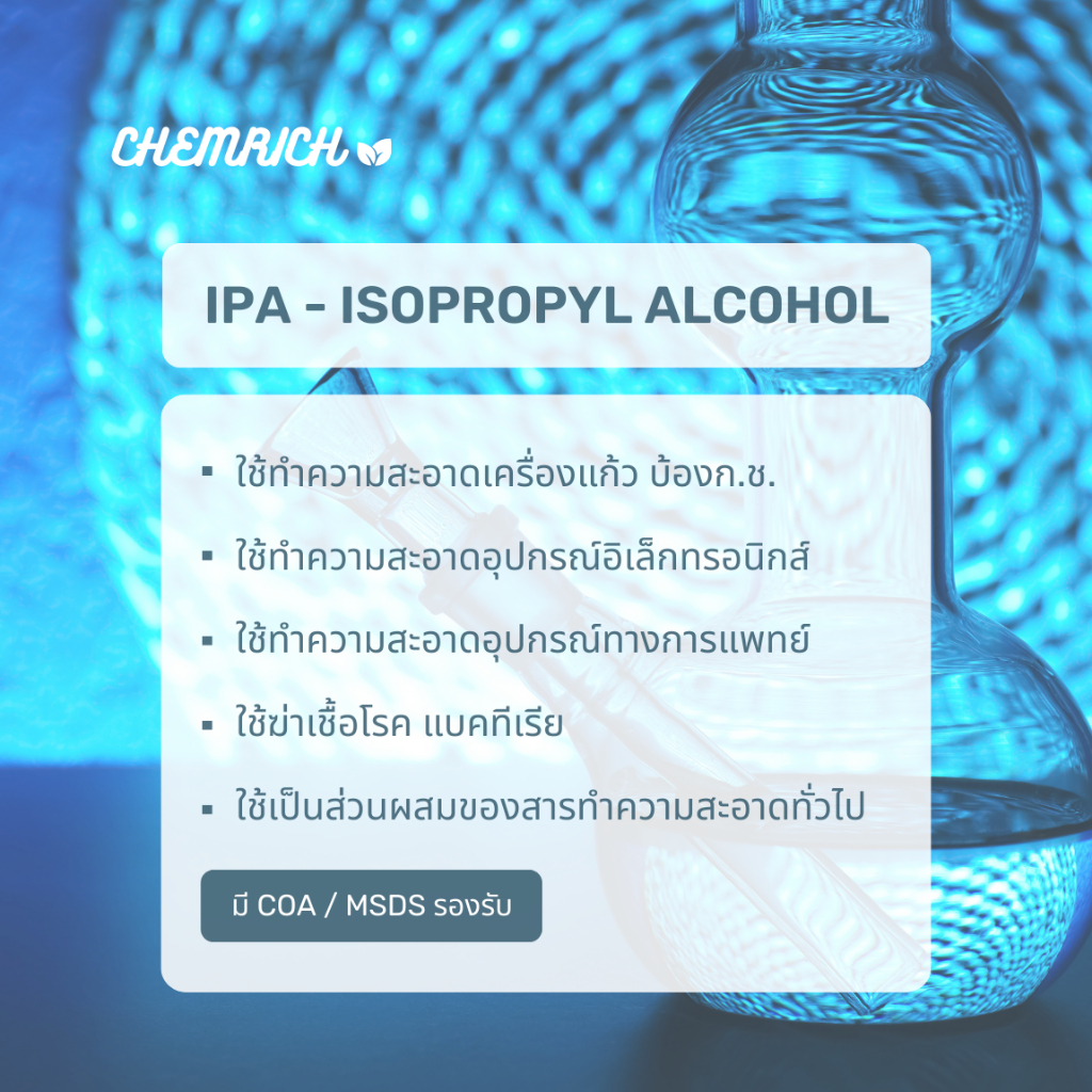 ... OA รับรอง 💙 IPA - สารทำความสะอาดประสิทธิภาพสูง ไอโซโพรพิลแอลกอฮอล์ ถือเป็นแอลกอฮอล์ชนิดหนึ่งที่มีคุณสมบัติในการฆ่าเชื้อโรค จึงนิยมนำมาใช้ทำเป็นน้ำยาทำความสะอาดเพื่อฆ่าเชื้อโรคต่างๆ นอกจากนี้ยังนำมาใช้เป็นน้ำยาทำความสะอาดเครื่องแก้ว บ้องแก้ว โดยใช้คู่กับดีเกลือฝรั่ง (Epsom salt) ในการขจัดคราบดำอีกด้วย สินค้าของบริษัท มีเอกสาร MSDS / COA รับรอง