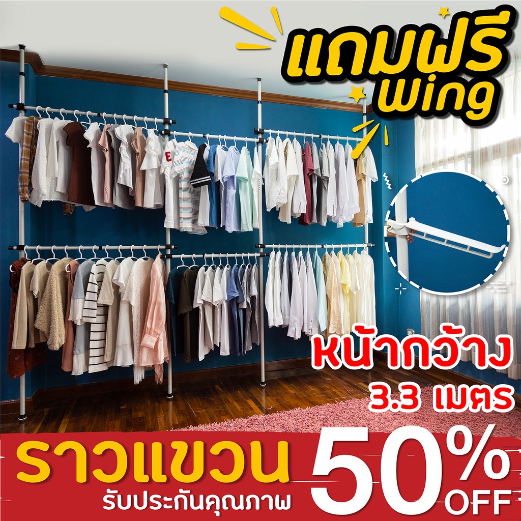 ... ง: 2.1-3.3 เมตร (ชุดใหญ่) (เพื่อความแข็งแรง แนะนำขยายไม่เกิน 1 m./ราว) ความสูง : ใช้ได้กับเพดานสูง 2.0 – 3.1 เมตร จำนวนราวแขวน: ชุดใหญ่: 6 ราวแขวน สี : ขาวล้วน ,ขาวข้อต่อดำ ,ดำ ,ลายไม้ รับน้ำหนักได้มากสุด: 50 กิโลกรัมต่อราวแขวน (เสื้อยืดประมาณ 100 ตัว) ============== ใช้ได้กับพื้นผิว: พื้นไม้/ปูน/อิฐ/ฝ้าฉาบเรียบ/กระเบื้อง/หินอ่อน และอื่นๆ บรรจุภัณฑ์: Carton Box การรับประกัน: รับประกันสินค้า 90 วันนับจากวันได้รับสินค้า