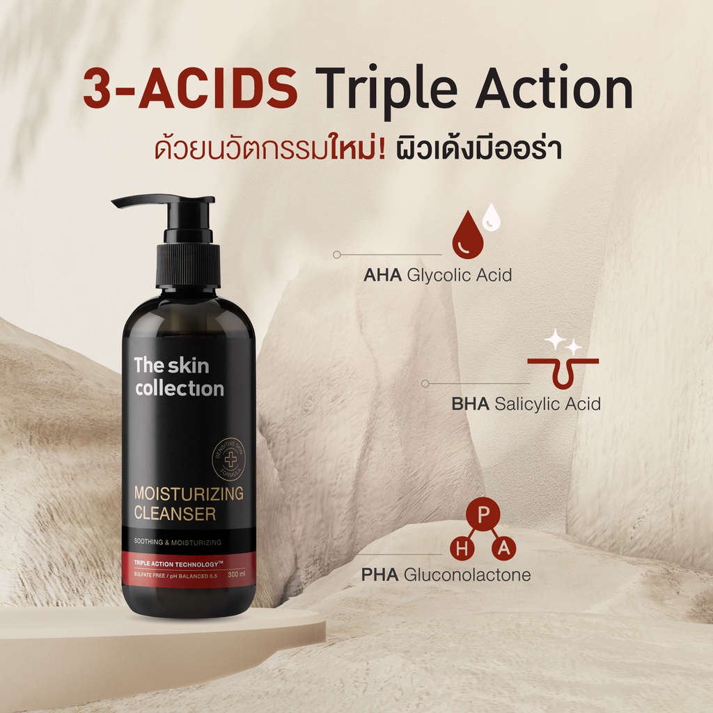 ... างดำบนใบหน้า ✓ กระตุ้นการผลัดเซลล์ผิว ช่วยฟื้นฟูสภาพผิวได้เร็วขึ้น ทำให้ริ้วรอยต่าง ๆ ลดเลือนลง และช่วยปรับสีผิวให้เรียบเนียนสม่ำเสมอ ✓ ช่วยผลัดเซลล์ผิวที่ตายแล้ว และกำจัดสิ่งอุดตันตามรูขุมขน อีกทั้งยังช่วยลดอาการอักเสบ กระชับรูขุมขน กระตุ้นการสร้างเซลล์ผิวใหม่ที่เรียบเนียนกว่า ทำให้รอยสิวดูจางลง ดีต่อผิวของผู้ที่เป็นสิวง่าย BHA มีคุณสมบัติ ✓ ช่วยขจัดเซลล์ผิวเก่า ทำให้ผิวดูกระจ่างใส ซึมเข้าสู่รูขุมขนได้โดยไม่ก่อให้เกิดการอุดตัน ✓ ช่วยปลอมประโลมผิวจากการระคายเคือง ลดการอักเสธและอาการเเดง PHA มีคุณสมบัติ ✓ ช่วยเติมความชุ่มชื้นให้ผิว หากใช้ร่วมกับ AHA จะช่วยลดโอกาสการแพ้ของผิวได้ ✓ ช่วยขจัดเซลล์ผิวที่เสื่อมสภาพ และปรับสภาพผิวให้เนียนและมีโทนสีที่เสมอกัน วิธีใช้ผลิตภัณฑ์ ใช้ล้างทำความสะอาดใบหน้า สามาาถใช้แทนโฟมหรือสบู่ *** คำเตือน *** - ควรทดสอบอาการแพ้ก่อนการใช้ผลิตภัณฑ์ - ไม่แนะนำสำหรับสตรีมีครรภ์ และหญิงให้นมบุตร ✓ Triple Acid Blend (AHA, BHA, PHA) ✓ Sulfate-Free ✓ Mild Surfactants ✓ pH Balanced 5.5 ✓ Fragrance-Free ✓ Paraben-Free ส่วนประกอบ / INGREDIENTS LIST AQUA, COCAMIDOPROPYL BETAINE, SODIUM LAUROYL SARCOSINATE, GLYCERIN, DISODIUM LAURETH SULFOSUCCINATE, SODIUM CHLORIDE, POTASSIUM OLIVOYL HYDROLYZED WHEAT PROTEIN, PEG-120 METHYL GLUCOSE DIOLEATE, GLYCOLIC ACID, PANTHENOL, ALLANTOIN, CITRONELLOL, GERANIOL, CITRONELLYL ACETATE, CITRUS SINENSIS OIL, D-LIMONENE, CINNAMALDEHYDE, LINALOOL, BENZYL ACETATE, BETA-IONONE, ALLYL CYCLOHEXYLPROPIONATE, BETA-PINENE, GAMMA-UNDECALACTONE, 2,4-DIMETHYL-3-CYCLOHEXENE CARBOXALDEHYDE, METHYLISOTHIAZOLINONE, SALICYLIC ACID, GLUCONOLACTONE หมายเหตุ : ห้ามใช้ในเด็กต่ำกว่า3ปี เลขที่ใบรับแจ้ง : 10-1-6500000493 ปริมาตรสุทธิ : 300ml สามารถเก็บรักษาได้ 3 ปีนับจากวันที่ผลิตสินค้า [การจัดส่งสินค้า] ร้านค้าจัดส่งสินค้าทุกวัน ไม่มีวันหยุด ลูกค้าที่ต้องการออกใบกำกับภาษี หากแจ้งรายละเอียดการขอใบกำกับภาษีในระบบแล้วรบกวนทักแชทร้านค้า แจ้งแอดมินผ่านแชทอีกครั้งนะคะ