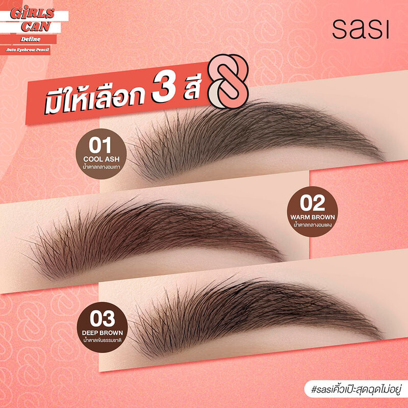 Cr.facebook.com/sasidiary SASI Girls Can Auto Eyebrow Pencil 0.3g #03 Deep Brown คิ้วอยู่ครบ ไม่กุดระหว่างวัน ติดทน กันน้ำ กันเหงื่อ ด้วยดินสอเขียนคิ้วหัวตัดสามเหลี่ยม ดีไซน์เข้ามุมเป๊ะ จะคิ้วทรงไหนก็เขียนง่าย Define ได้ตามต้องการ ดินสอเนื้อนุ่ม ไม่บาดคิ้ว เบลนง่าย ผสมสารบำรุง Vitamin E แพ็คเกจแท่ง