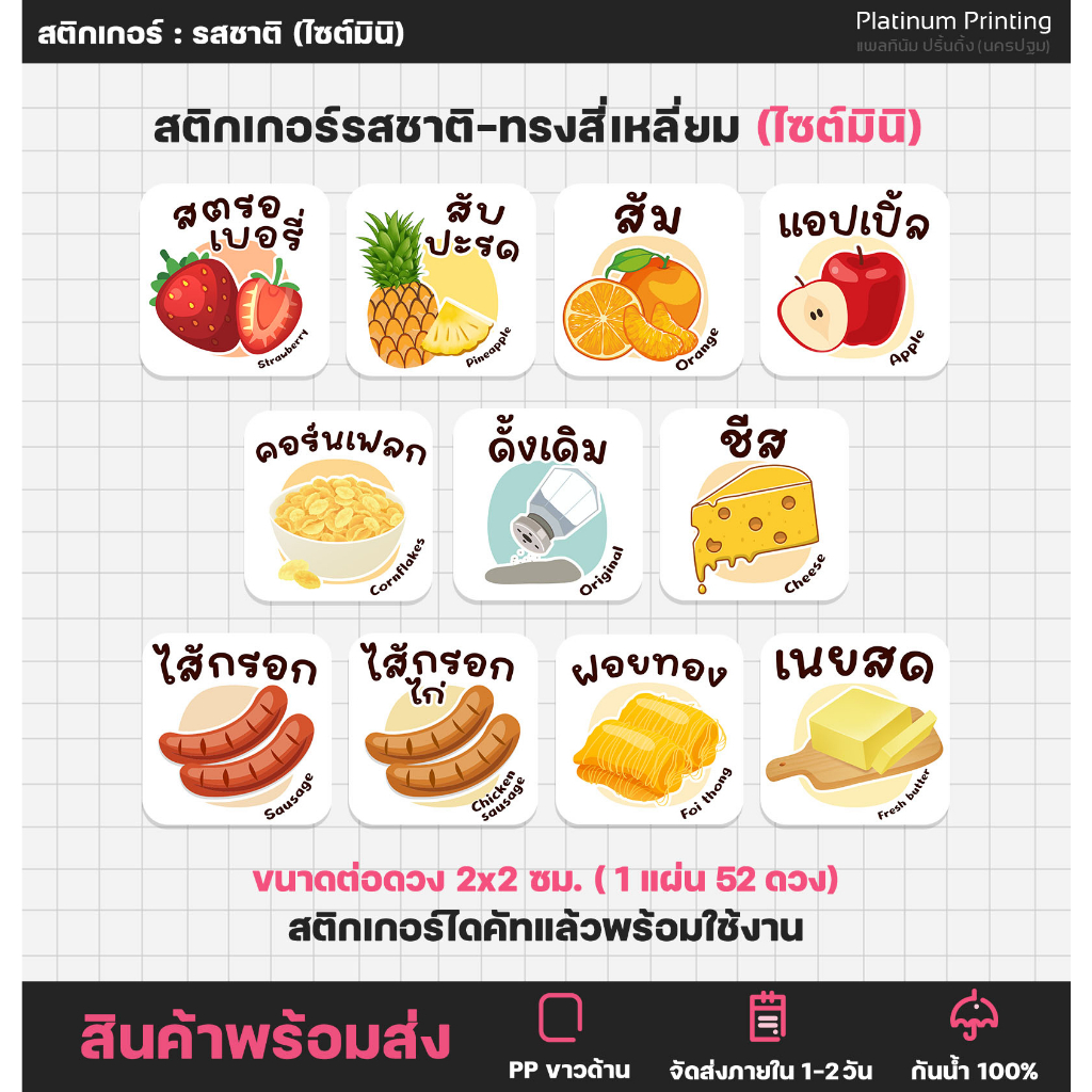 สติกเกอร์รสชาติ (ไซต์มินิ) ทรงสี่เหลี่ยม ไส้ขนม ไส้ครีม ผงเขย่า รสชาติผลไม้ สติกเกอร์ฉลากสินค้า ไส้ขนมต่างๆ [no.S80] ขนาดต่อดวง 2x2 ซม. (1แผ่น 52 ดวง) ประเภทสติกเกอร์ : PP (กันน้ำ) หมายเหตุ - จัดส่งสินค้าให้ขนส่ง หลังได้รับคำสั่งซื้อภายใน 2วันทำการ - ไม่ส่งของวันเสาร์-อาทิตย์ #สติกเกอร์ฉลา