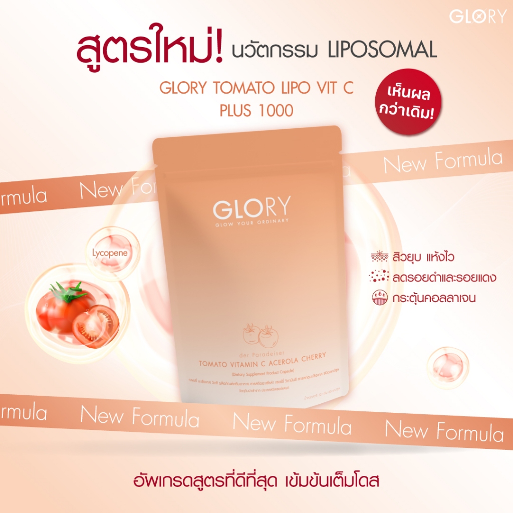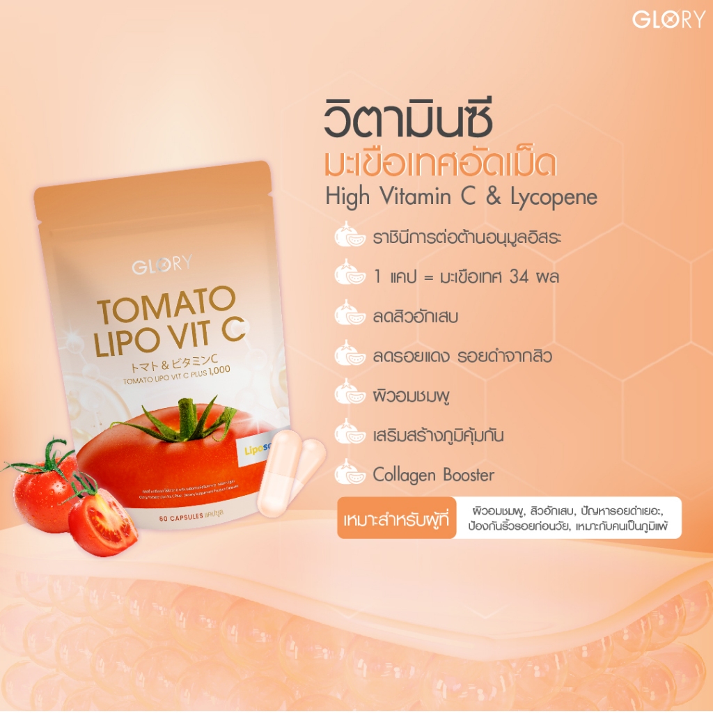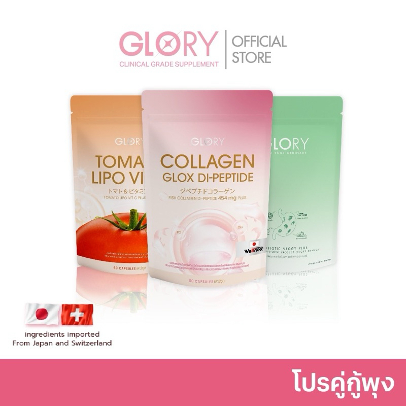 ... คอลลาเจน (COLLAGEN DI-PEPTIDE) และวิตามินซีมะเขือเทศ (TOMATO VIT-C) สูตรทั่วไป : รับประทาน (ซองชมพู + ซองส้ม) ครั้งละ 1 เม็ด ทุกเช้าและก่อนนอน สูตรพิเศษ : รับประทาน (ซองชมพู + ซองส้ม) ครั้งละ 2 เม็ด ทุกเช้าและก่อนนอน ข้อแนะนำในการทาน GLORY เวจจี้ พลัส โพรไบโอติกส์ (Probiotic Veggy Plus) แบบที่ 1 : ทานเวจจี้ พลัส โพรไบโอติกส์ (Probiotic Veggy Plus) ตามด้วย เบาเบาโกโก้ (Glory Baobao Cocoa) และกลอรี่ คอลลาเจน (Collagen Di-peptide) และวิตามินซีมะเขือเทศ (Tomato Vit-C) โดยห่างกันประมาณ 20-30 นาที *สารสกัด COLLAGEN DI-PEPTIDE นำเข้าจากญี่ปุ่น และสารสกัด TOMATO VIT-C นำเข้าจากสวิตเซอร์แลนด์ คำเตือน : เพื่อผลลัพธ์ที่ดีขึ้นควรดื่มน้ำ 2-3 ลิตรต่อวัน และรับประทานอาหารให้ครบ 5 หมู่เป็นประจำ
