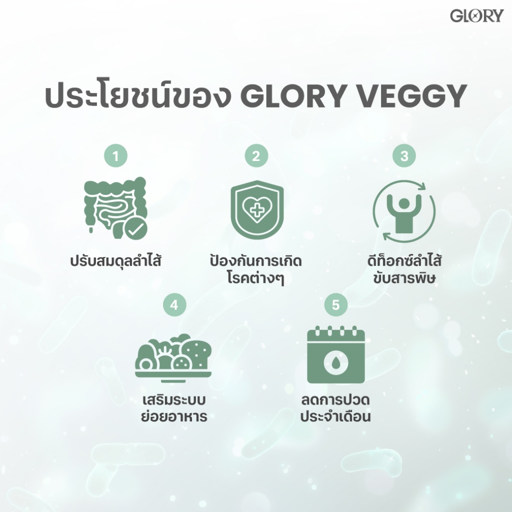 (จำนวน 1 ซอง) GLORY เวจจี้ พลัส โพรไบโอติกส์ (Probiotic Veggy Plus) 20 แคปซูล (จำนวน 1 ซอง) กลอรี่ คอลลาเจน (COLLAGEN DI-PEPTIDE) 60 แคปซูล เลข อย. จดแจ้ง 10-1-20960-5-0093 (จำนวน 1 ซอง) วิตามินซีมะเขือเทศ (TOMATO VIT-C) 60 แคปซูล เลข อย. จดแจ้ง 10-1-20960-5-0112 ข้อแนะนำในการทาน กลอรี่