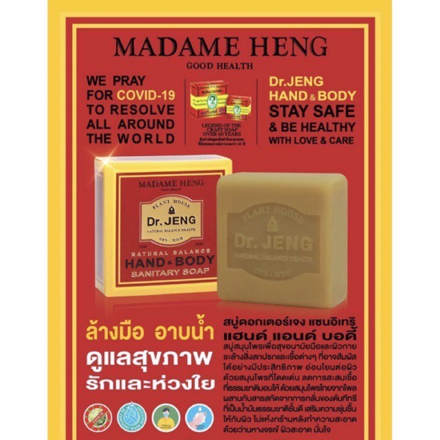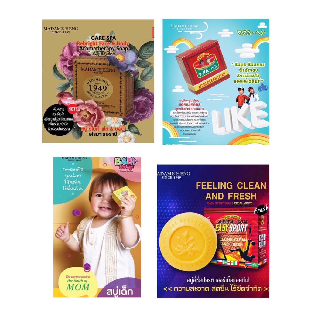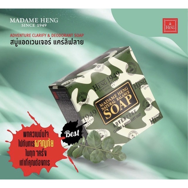 ... ะผสมตัวยาสมุนไพรที่ป้องกันการเกิดสิว ฝ้า กระ จุดด่างดำ และเม็ดสิวบนแผ่นหลัง มีสรรพคุณช่วยระงับกลิ่นเหงื่อและกลิ่นกาย สะอาด สดชื่น 2.สบู่ดอกเตอร์เจงบาร์ลานซ์ โบทานิคอล 150กรัม มอบคุณประโยชน์จากธรรมชาติ ฟ้าทะลายโจร ขมิ้น คาโมมายล์ ผสานเพื่อการดูแลผิว อย่างมีประสิทธิภาพ ลดปัญหาผิวที่ไว ต่อปัจจัยระคายเคือง สิว ฝ้า กระ ผิวหยาบกระด้าง ระงับ กลิ่นเหงื่อ กลิ่นกาย ผลลัพธ์หลังการใช้ประจำต่อเนื่องทุกวัน ผิวสุขภาพดี ลดการระคายเคือง แลดูนุ่ม เรียบเนียน หอมสดชื่นติดกาย .... 3.สบู่ลายทหาร แอดเวนเจอร์ 150กรัม ผู้ที่ชื่นชอบการโลดโผน และหลงใหลในธรรมชาติ สนุกไปกับกิจกรรมเอ็กซ์ทรีม สัมผัสอีกหนึ่งแนวรูปแบบของการทำความสะอาดผิวด้วยแนวกลิ่นหอม ผ่อนคลาย สดชื่นทุกครั้งที่ได้อาบ ให้ความรู้สึก สบายผิวและด้วยคุณสมบัติจากส่วนผสมเฉพาะสูตร ANTISEPTIC จาก FARNESOL ร่วมกับMELALEUCA ALTERNIFOLIA ที่ช่วยยับยั้งแบคทีเรียต้นเหตุที่อาศัยอยู่บนผิวหนัง ผลตอบรับหลังการใช้ สิวและกลิ่น ลดลงอย่างมีประสิทธิภาพ เหมาะกับผู้ที่มีปัญหาเหงื่อไคลมาก กลิ่นอับชื้น กลิ่นอับที่เท้า ช่วยลดผดผื่น สิวบนใบหน้า สิวบนแผ่นหลัง ลดปัญหารอยคล้ำใต้รักแร้ ขาหนีบ คืนความขาวใสเนียน ให้ผิวที่ลุยไปกับทุกกิจกรรมดูผุดผ่องกระจ่างใส ไม่หมองคล้ำ เมื่อใช้อย่างต่อเนื่องทุกวัน ผลลัพธ์ที่ได้ ผิวกระจ่างใสไร้กลิ่นเหงื่อ พกความมั่นใจไปกับการผจญภัยในทุกๆครั้งเท่าที่คุณต้องการ 4.สบู่เด็ก baby soap 150กรัม สบู่เด็กมาดามเฮง ได้พัฒนาสูตรสมุนไพรเป็นสูตรที่บรรจงสร้างขึ้นมาสำหรับเด็กโดยเฉพาะ ปรับให้เข้ากับผิวบอบบางของเด็ก บริสุทธิ์ อ่อนละมุน ไม่เกิดการระคายเคือง ปกป้องผิวจากผดผื่นคัน ผื่นผ้าอ้อม ให้ความชุ่มชื่นด้วยคุณสมบัติของสมุนไพรธรรมชาติ จากคาโมมายล์ ที่คัดสรรอย่างละเอียดอ่อนเพื่อผิวเด็ก สะอาดเนียน สดใสตั้งแต่วัยเยาว์ 5.สบู่ว่านหางจรเข้วิตามินอี aloevera vitamin E 150กรัม อโลเวร่า พลัส วิตามินอี ผสานคุณค่าว่านหางจระเข้ ที่มีประสิทธิภาพสูง ในการซ่อมแซมเซลล์ผิว สมานรอยแผลเป็นต่างๆ ดูเนียนนุ่ม ผิวดูผ่องสดใสไม่แห้งกร้านดูอ่อนเยาว์ ช่วยระงับ กลิ่นเหงื่อและกลิ่นตัว 6.สบู่สิว acne soap 150กรัม สบู่สิว สมุนไพร แอคเน่เครียร์ สูตรต้นตำรับ ด้วยส่วนผสมของ tea tree ให้หน้าเกลี้ยงใส ลดสิวความมันส่วนเกิน ไม่เกิดการสะสมแบคทีเรีย ระงับกลิ่นกาย ผิวเรียบเนียนใส สิวผด สิวหนอง สิวอักเสบ สิวแผ่นหลัง 7.สบู่อีซี่สปอร์ต eazy sport 150กรัม สบู่อีซี่สปอร์ต เฮอร์เบิ้ลแอคทีฟ สบู่ทำความสะอาดผิวสดชื่นไร้ขีดจำกัด สำรับกิจกรรมทุกรูปแบบที่ไม่หยุด
