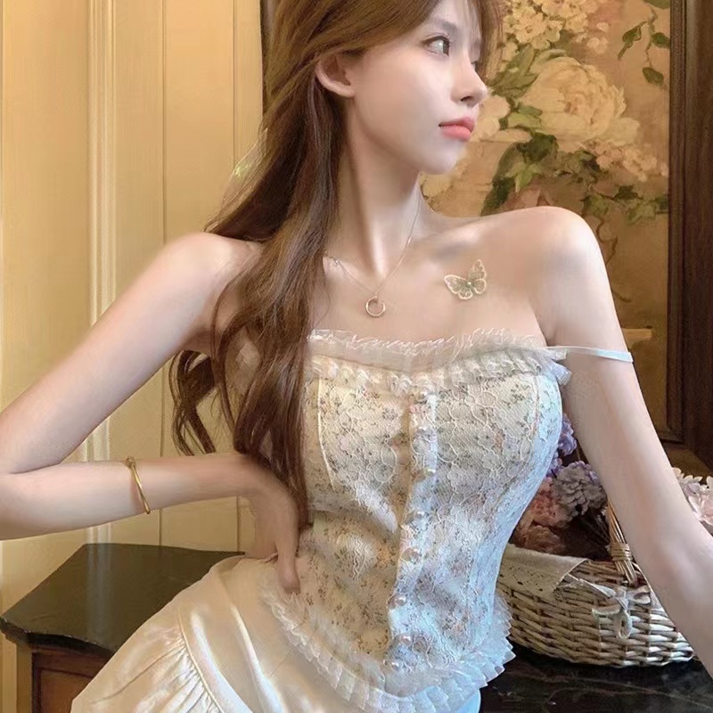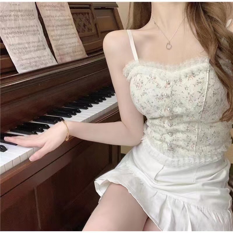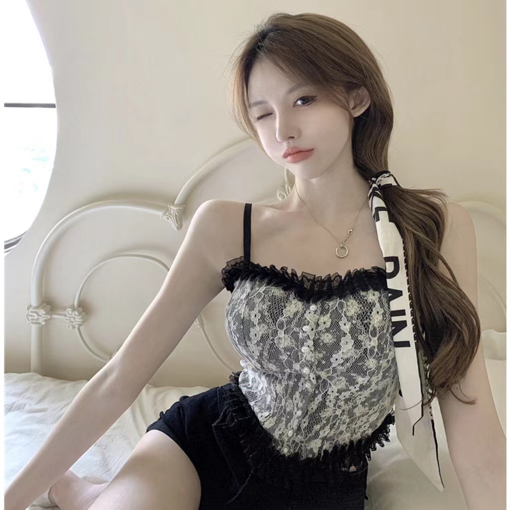 "50MIDNIGHT" ลด 50% 🌈 Youth shop สายเดี่ยวลูกไม้ กระดุมแต่งมุก สายปรับได้ สม็อคหลัง มีฟองน้ำเสริม รุ่น MW041