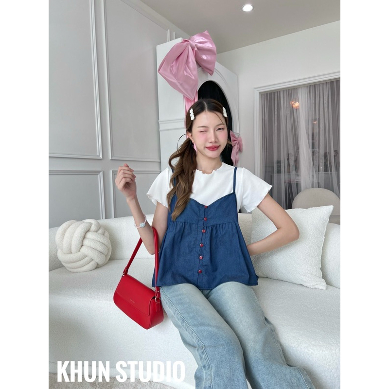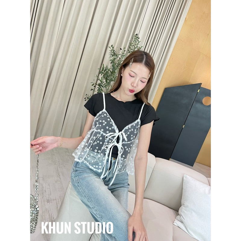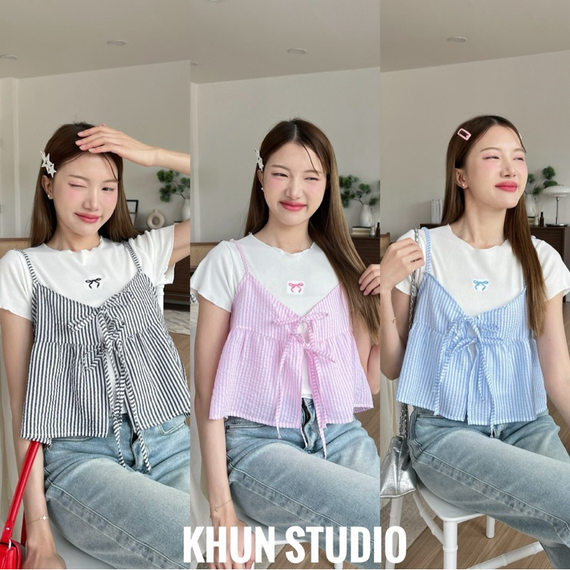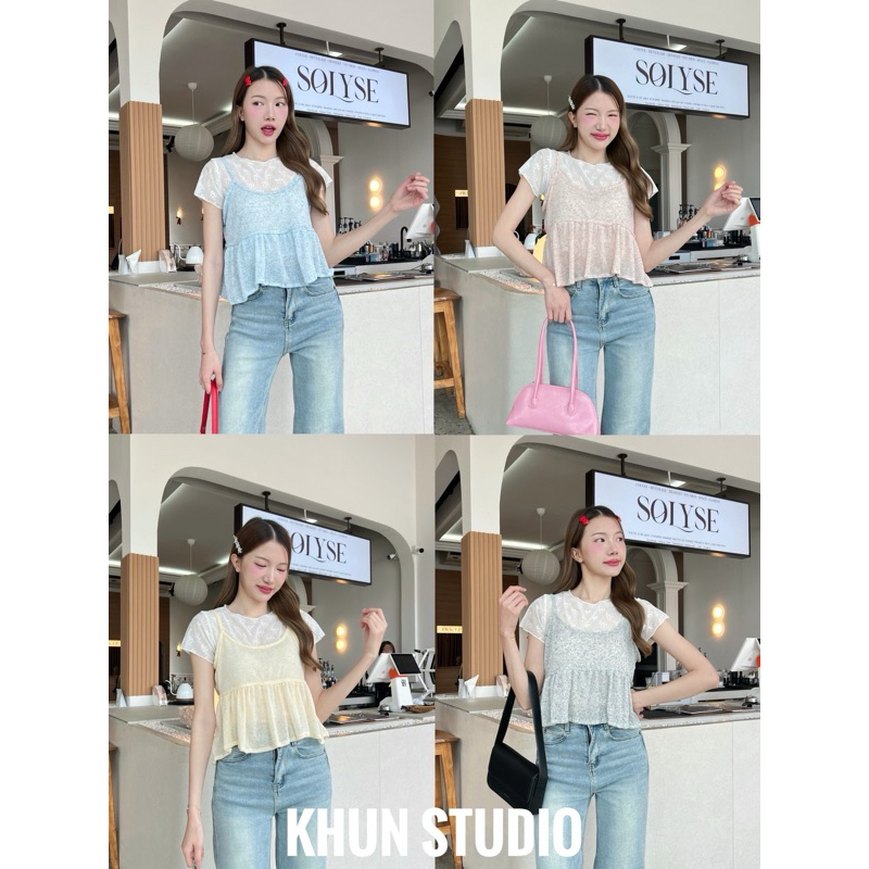🌟เสื้องานเซ็ต2ชิ้น ชิ้นในเป็นผ้ายืด ชิ้นนอกผูกหน้าระบายชาย/ J2-123/COOK-2ชิ้น