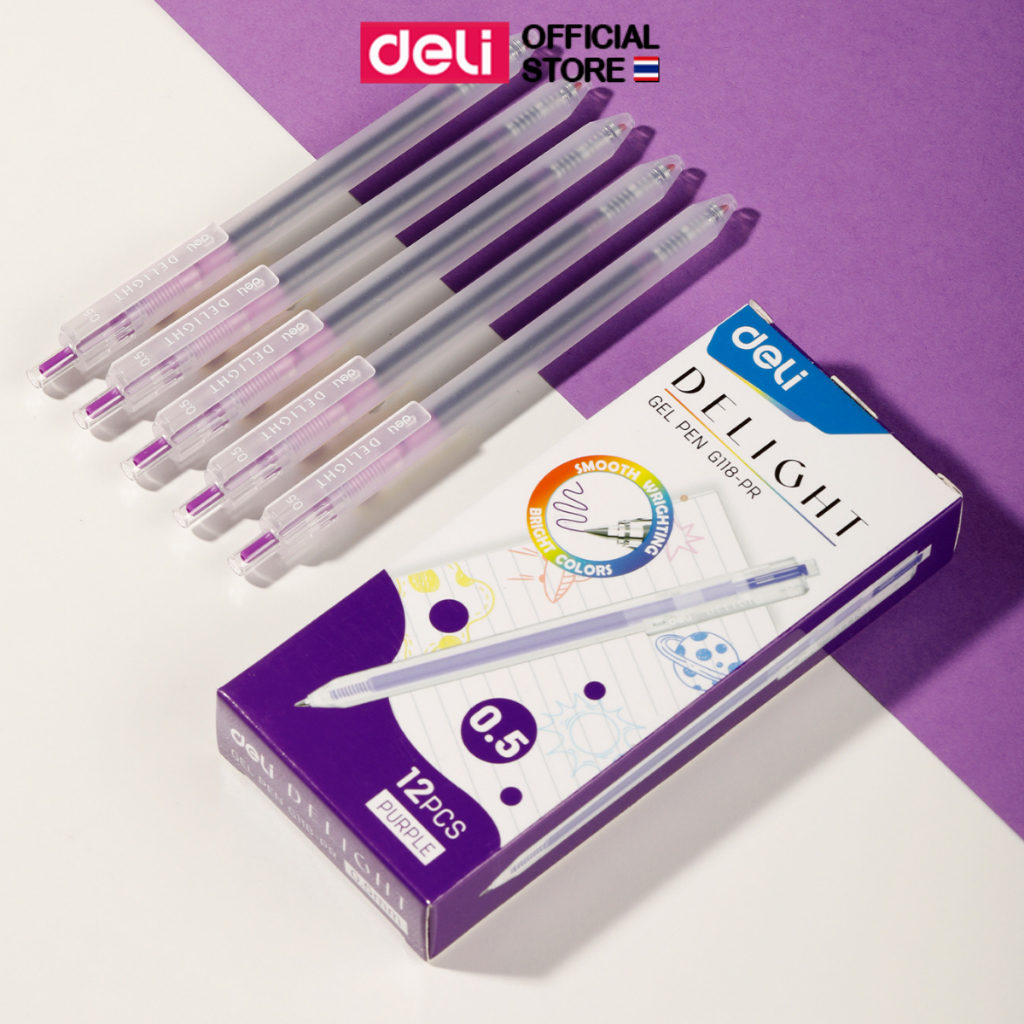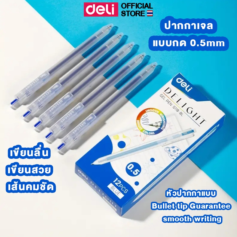 🛒🧡Deli : DL-G118 ปากกาเจลแบบกด(Gel Pen 0.5 mm.) ✒️ขนาดเส้น 0.5 มม. หมึกเจลคุณภาพดี ✒️น้ำหมึกคุณภาพดี เส้นคมชัด เขียนได้ลื่นและเรียบเนียน ✒️แห้งทันทีเมื่อเขียน ทำให้ไม่เลอะเทอะมือหรือกระดาษ 👍ใช้ระบบ Water Proof ทำให้หมึกไม่เลอะและไม่ซึมออกเมื่อไม่ใช้งาน 👍น้ำหมึกมีถึง 12 สีให้เลือกใช้ : สีน้ำเงิน
