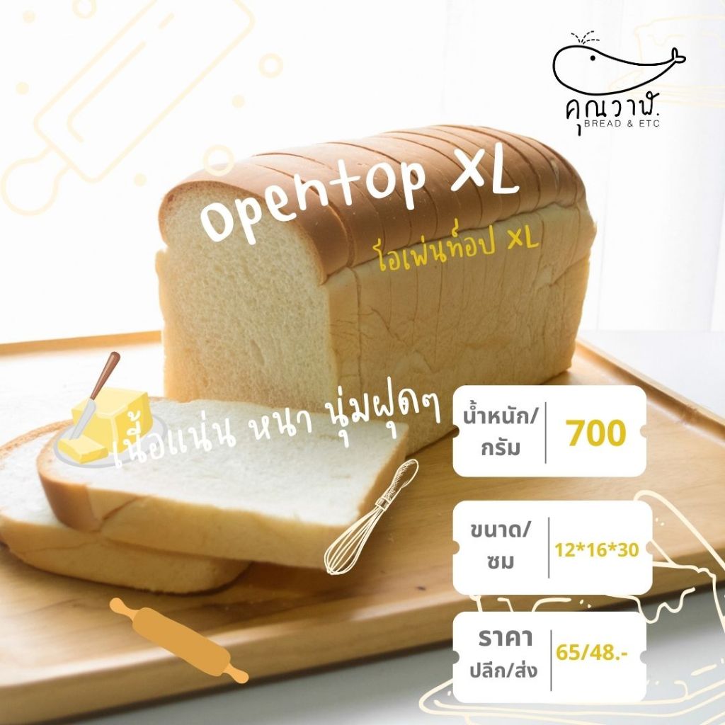 คุณวาฬ ขนมปังโอเพ่นท๊อป XL ขนมปังกะโหลก XL สำหรับปิ้งย่าง โทสต์ เนยนม น้ำตาล ช๊อคโกแลต
