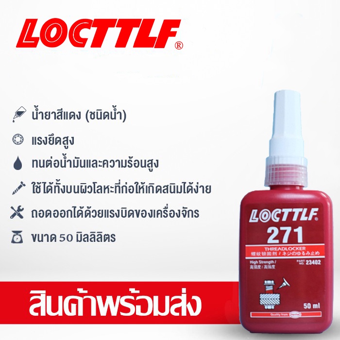 ... (เริ่มยึด/ยึดเต็มที่) 5นาที/24ชั่วโมง 4. อุณหภูมิใช้งานต่อเนื่องสูงสุด 180˚C ......................................................................................................................................................... (เบอร์ 263/271) เบอร์ 263 สีแดง กันสนิม ทนน้ำมันและทนต่อการกัดกร่อน เบอร์ 271 สีแดง ทนสารเคมี ป้องกันกัดกร่อน - แรงยึดสูง - สี: แดง - เหมาะสำหรับงานที่ถอดออกได้ด้วยเครื่องจักร วิธีใช้ (เบอร์ 263) 1. ใช้ได้กับเกลียวโลหะขนาด ถึง 3/4" 2. แรงยึดสูง 220/290ปอนด์.นิ้ว 3. เวลาการยึดติด (เริ่มยึด/ยึดเต็มที่) 5นาที/24ชั่วโมง 4. อุณหภูมิใช้งานต่อเนื่องสูงสุด 180˚C