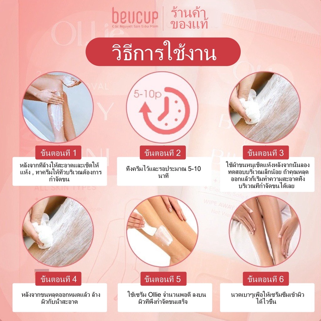การกำจัดขนไม่เคยปลอดภัย มีประสิทธิภาพ รวดเร็วและอ่อนโยนขนาดนี้มาก่อน! ข้อมูลพื้นฐาน - ชื่อผลิตภัณฑ์ : ครีมกำจัดขน OLLIE กำจัดขนบริเวณส่วนตัว รักแร้ แขน ขา กำจัดขนอย่างปลอดภัยและไม่เจ็บปวด - ความจุ : 70มล - แหล่งกำเนิดสินค้า: รับผิดชอบในการนำผลิตภัณฑ์ออกสู่ตลาด HEALTH AND CARE TECHNOLOGY.,JSC