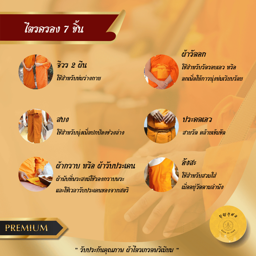 ผ้าไตรจีวร ไตรเต็ม ไตรครองคู่ 7 ชิ้นครบชุด เนื้อโทเร/มัสลิน รับประกันคุณภาพเกรดพรีเมียม ไตรครองคู่ เย็บตะเข็บคู่ เป็นผ้าใหม่ทุกชุดและได้มาตรฐาน สามารถใช้ได้จริงทุกชุด มีขนาด 1.9, 2.0, 2.1, 2.2 เมตร พร้อมโบว์และคำถวายตามภาพ **ขนาด 2.1 และ 2.2 เมตร จะเป็นขนาดพิเศษที่ต้องสั่งตัดเพิ่มเติม คุณลูกค้าสา