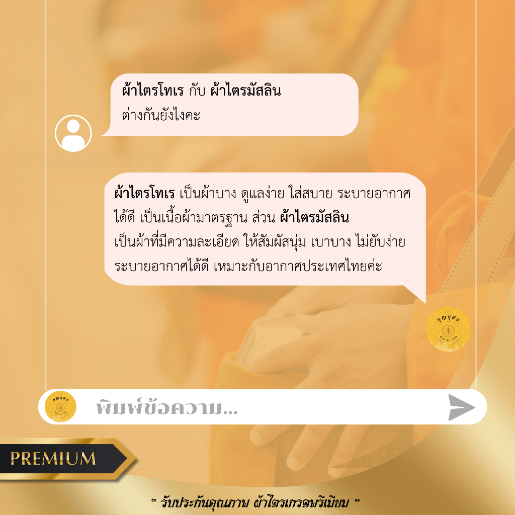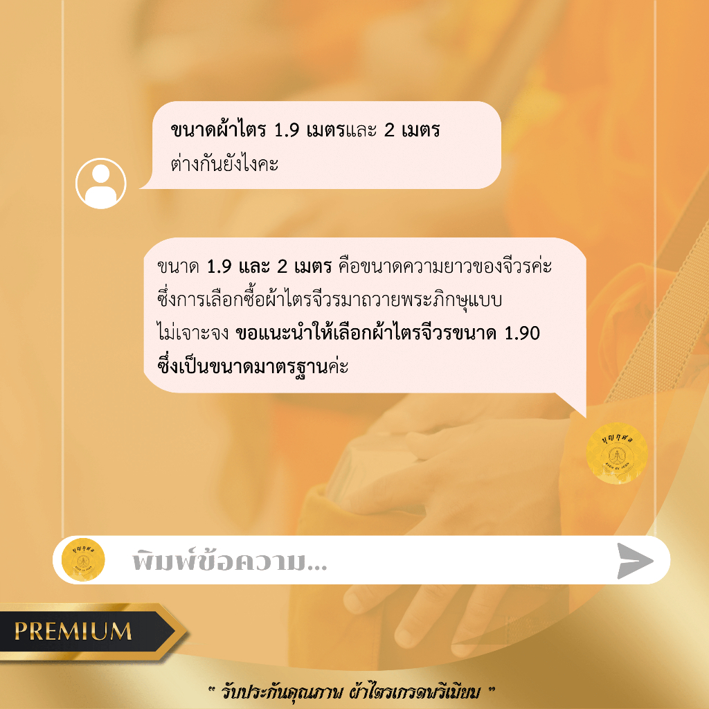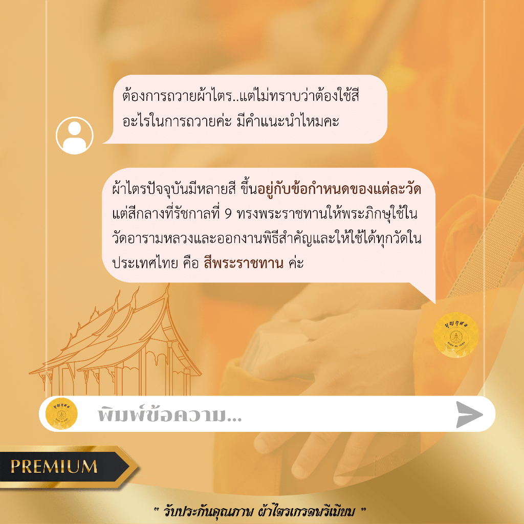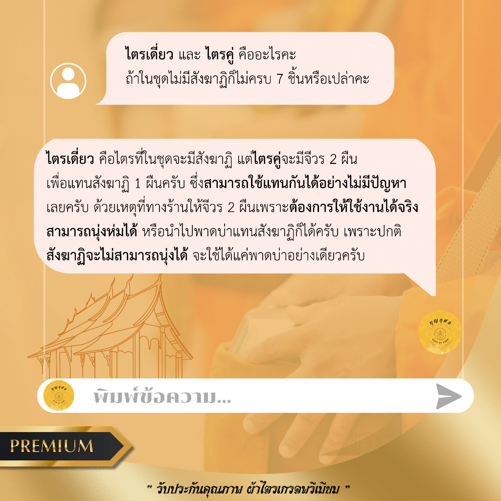 ... มารถทักแชทเพื่อสอบถามกับทางร้านได้เลยครับ** ผ้าไตรจากทางร้านเป็นไตรครองคู่ จะไม่มีสังฆาฏิแต่จะให้เป็นจีวร 2 ผืนแทนครับ ภายในผ้าไตรประกอบไปด้วย 1.จีวร (1.9/2.0/2.1/2.2 เมตร) 2 ผืน 2.อังสะ 3.สบง 4.ผ้ารัดอก 5.รัดประคตเอว 6.ผ้ากราบ เนื่องจากทางร้านต้องการให้พระที่ท่านใส่ สามารถใช้ได้จริงทุกผืน ซึ่งสังฆาฏิไม่สามารถสวมใส่ได้ สามารถใช้ได้แค่พับเพื่อพาดบ่า ทางร้านจึงให้เป็นจีวรแทนครับ คุณลูกค้าไม่ต้องเป็นกังวลว่าจะไม่ครบ 7 ชิ้นเลยครับ เพราะจีวรสามารถใช้ทดแทนสังฆาฏิได้โดยไม่มีปัญหาหรือผิดหลักใดๆ อีกทั้งยังให้ประโยชน์ที่มากกว่าและไตรคู่ยังเป็นเกรดที่สูงกว่าไตรเดี่ยวที่มีสังฆาฏิด้วยครับ **ร้านค้าส่งของทุกวัน ยกเว้นวันอาทิตย์และวันหยุดนักขัตฤกษ์ เรายินดีให้บริการคุณลูกค้าด้วยใจเสมอ ขอบคุณครับ**