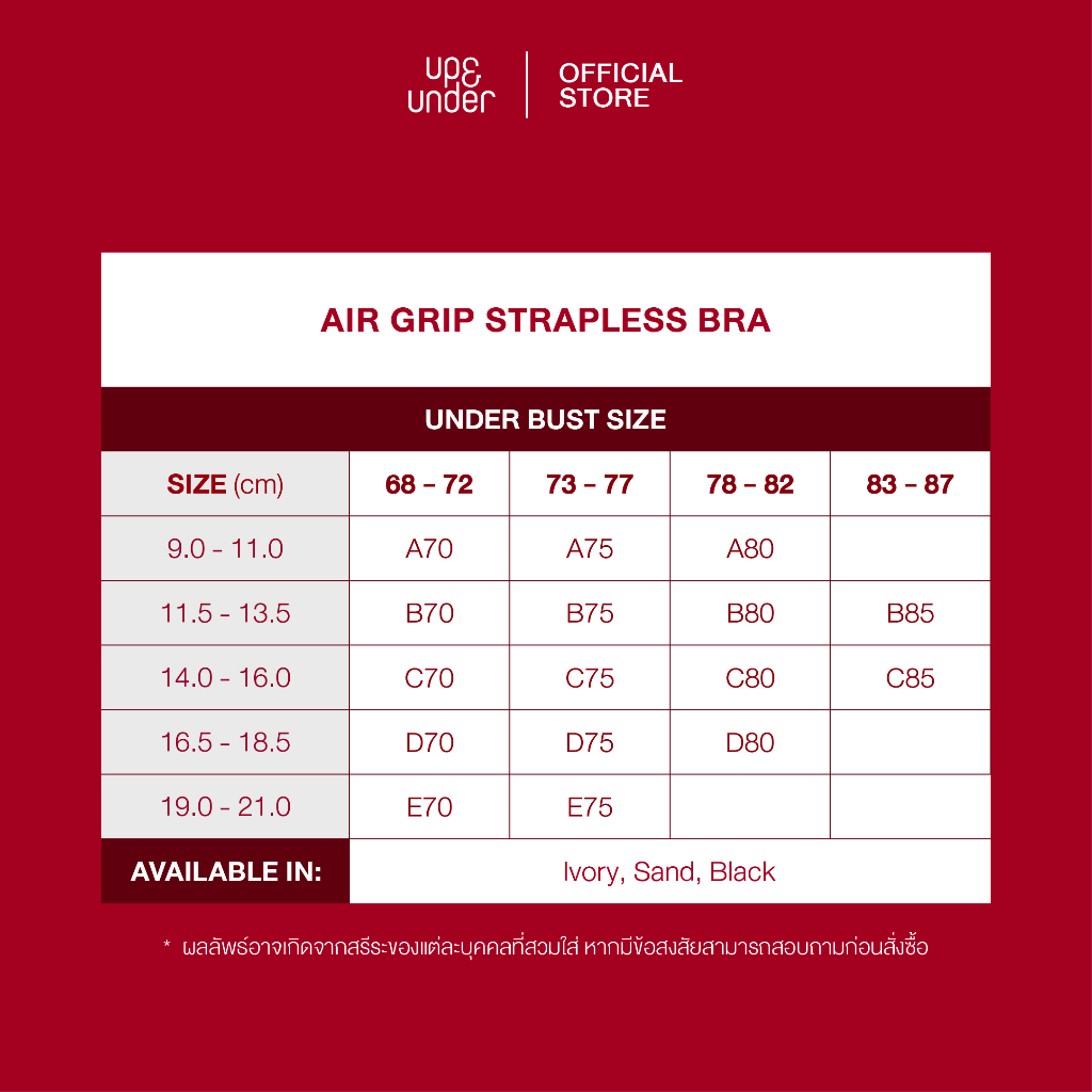 UP&UNDER : บราเกาะอก ไร้โครง รุ่น Air Grip Strapless เกาะแน่น ไม่หลุด เสื้อในเกาะอก ใส่สบาย เนื้อผ้าเย็น ไร้ขอบตะเข็บ บราเกาะอกแบบไร้โครง มาพร้อม Smart Grip Technology แถบกาวพิเศษรอบลำตัว เกาะแน่น ไม่ติดผิว เป็นฟอง Custom made เฉพาะของทางแบรนด์ ฟองไล่ระดับให้เหมาะกับทรงอกของแต่ละคัพ ใส่แล้วทรงสว