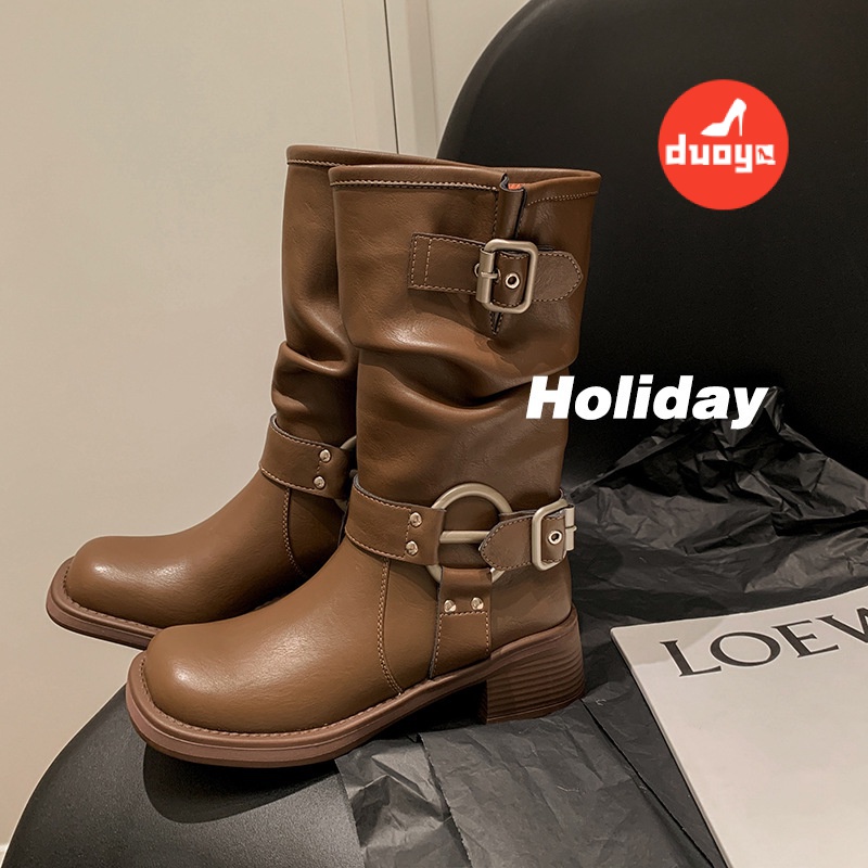Duoya Factory รองเท้าบูทมาร์ติน ทรงตรง แต่งหัวเข็มขัด สไตล์ตะวันตก สําหรับผู้หญิง ส่งฟรี