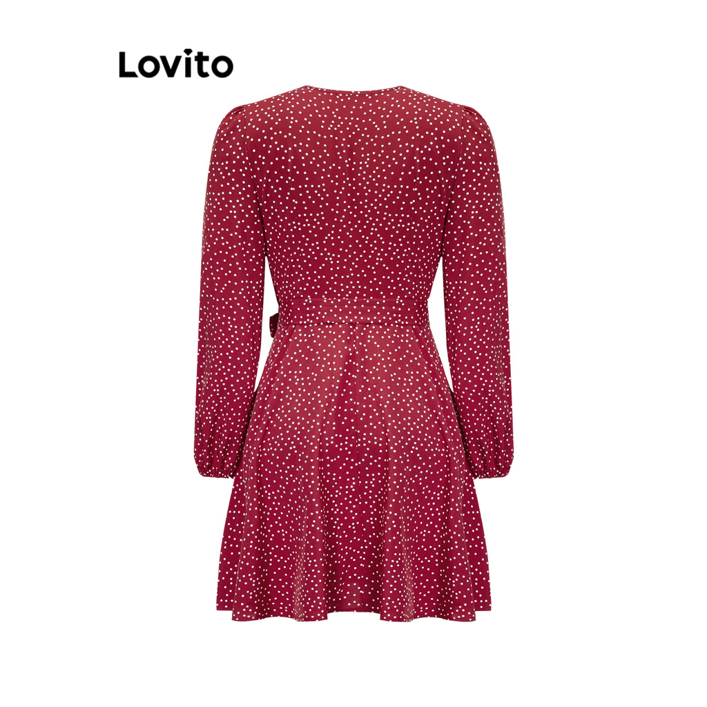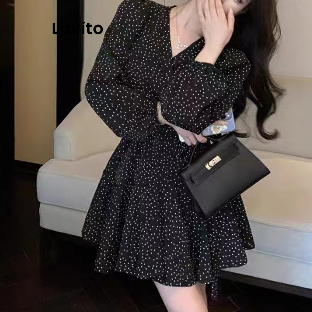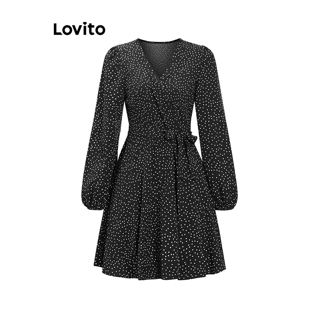 Lovito ชุดเดรสป้ายหน้า แขนพอง ลายจุด สไตล์ลำลอง สำหรับผู้หญิง LNE27238 (หลากสี)