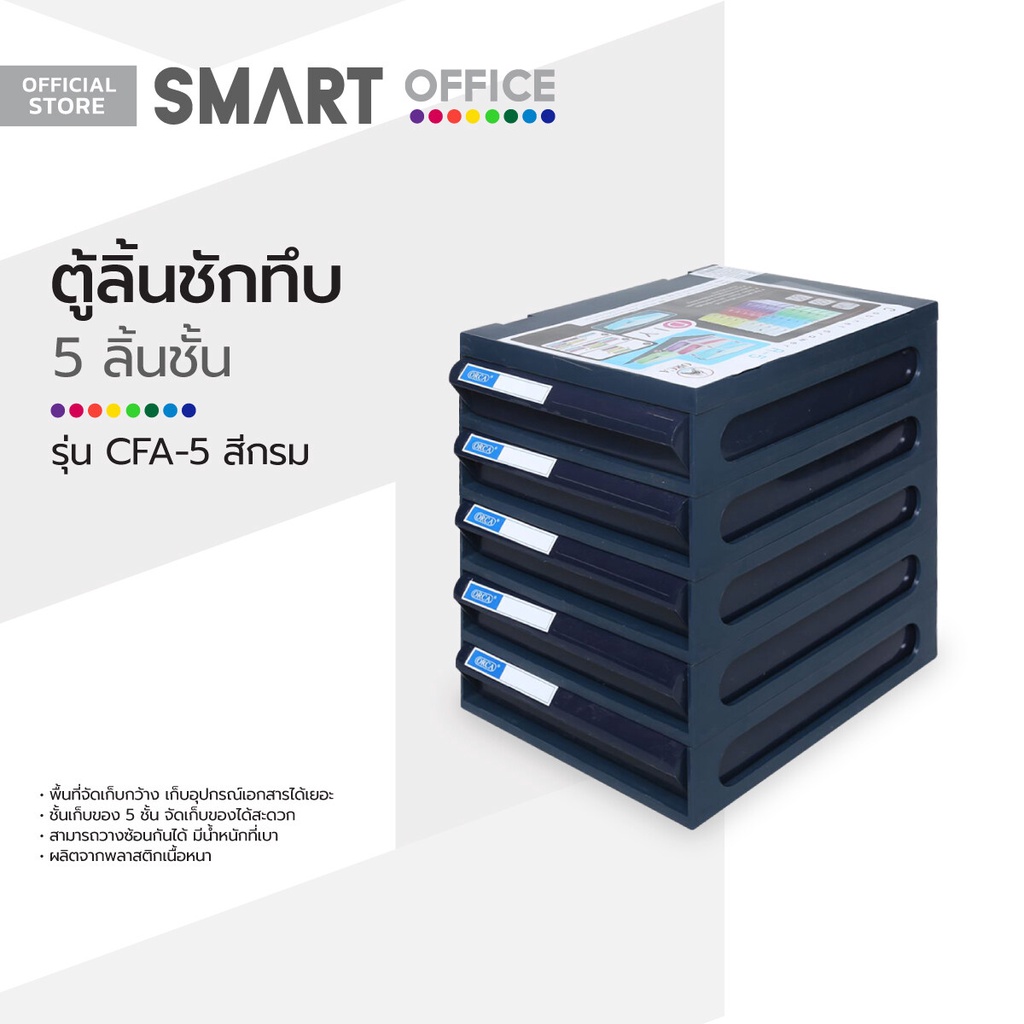 ... ู้ลิ้นชักทึบ 5 ชั้น ขนาด A5 รุ่น CFA-5 สีกรม รายละเอียดสินค้า • ผลิตจากพลาสติกคุณภาพดี มีความเหนียวและหนา • ลิ้นชักปิดสามารถได้สนิท ทำให้เก็บเอกสารมิดชิด • รางเลื่อนเปิด-ปิดง่าย แข็งแรงไม่ติดขัดขณะเลื่อน • มาพร้อมกับลิ้นชัก 5 ชั้น สามารถเก็บเอกสารได้มาก • สามารถวางตู้ลิ้นชักซ้อนกันได้อย่างกลมกลืน สวยงาม • จัดวางได้ทุกที่ มีน้ำหนักเบา สามารถเคลื่อนย้ายสะดวก • มีช่องใส่ป้ายชื่อ เพื่อการจัดเก็บเอกสารให้เป็นหมวดหมู่ • ใช้สำหรับใส่เอกสาร สิ่งของทั่วไปเพื่อความระเบียบเรียบร้อย • เหมาะสำหรับใส่เอกสารขนาด A5 • ขนาดสินค้า : กว้าง 17.5 x ลึก 24.3 x สุง 27 ซม. สินค้าภายในกล่อง • ORCA ตู้ลิ้นชักทึบ 5 ชั้น รุ่น CFA-5 สีกรม วิธีการใช้งาน • เหมาะสำหรับใส่เอกสารและนิตยาสารต่างๆ เพื่อความเป็นระเบียบ การบำรุงรักษา / ข้อเสนอแนะ / คำแนะนำ • ควรเลือกเลือกใช้งานให้เหมาะสมกับประเภทสินค้า • ห้ามดัดแปลง แก้ไขสินค้า หรือนำไปใช้งานผิดประเภท • ห้ามใช้สารเคมีที่มีฤทธิ์เป็นกรด และด่างทำความสะอาด