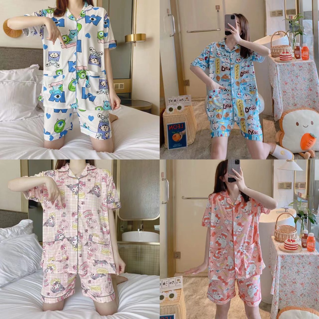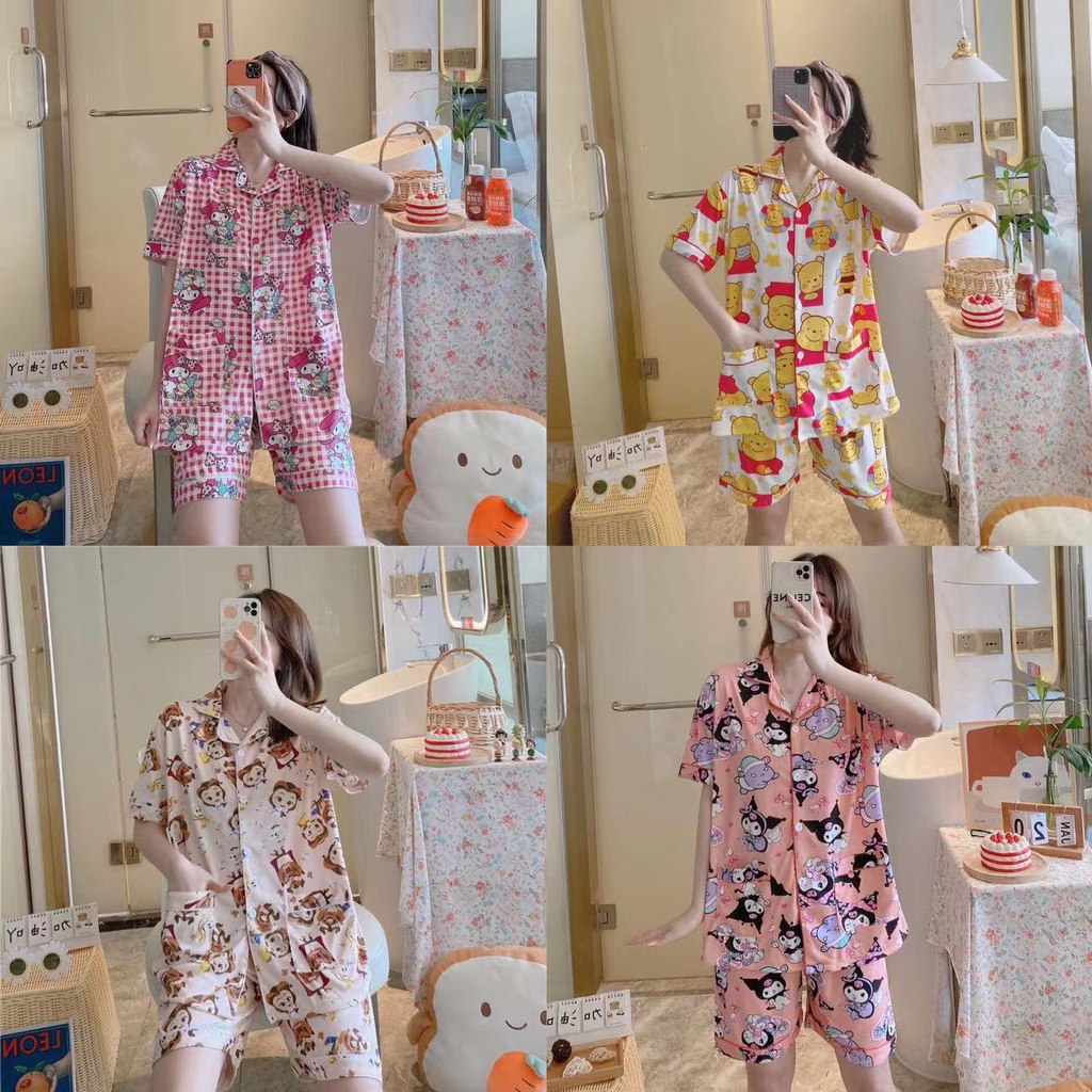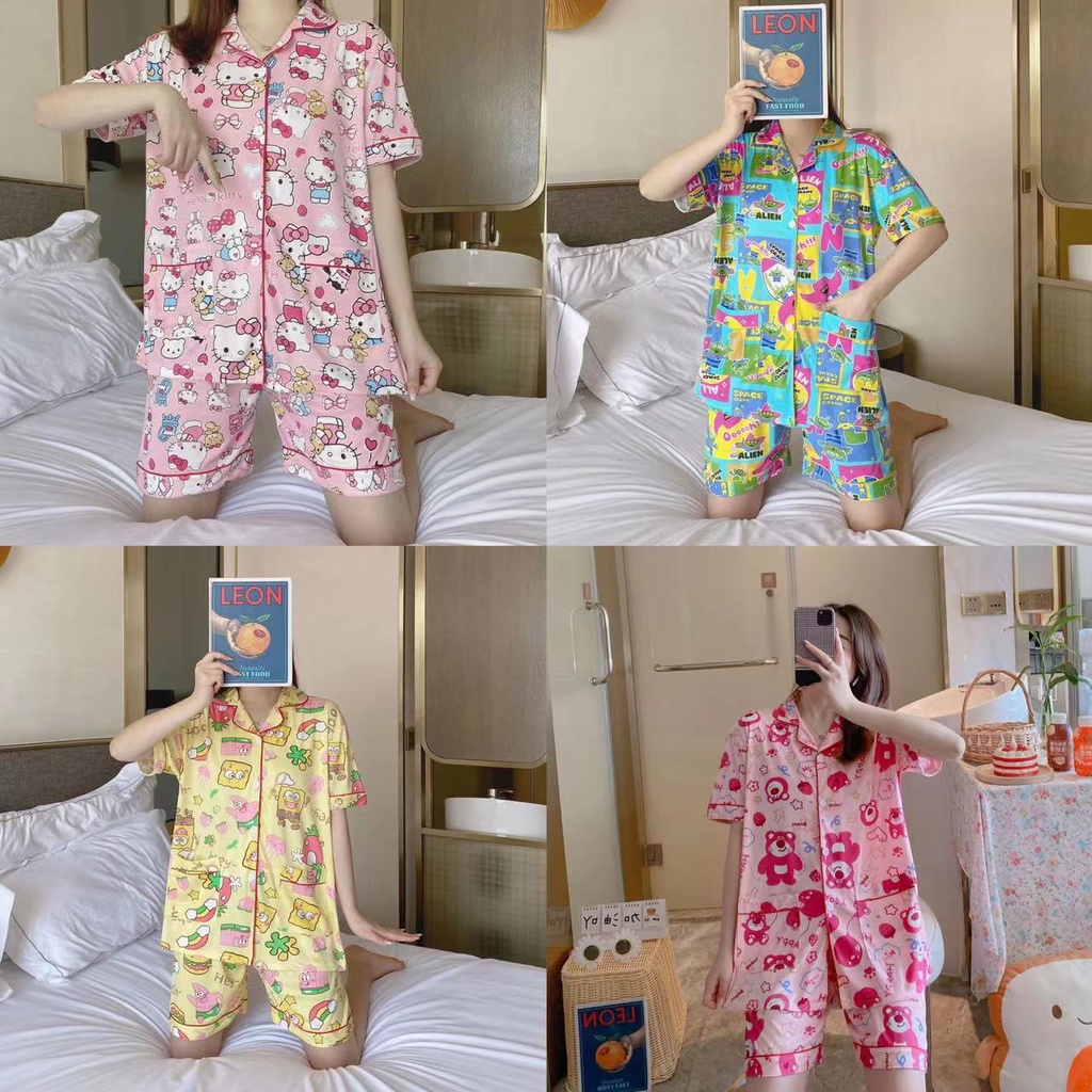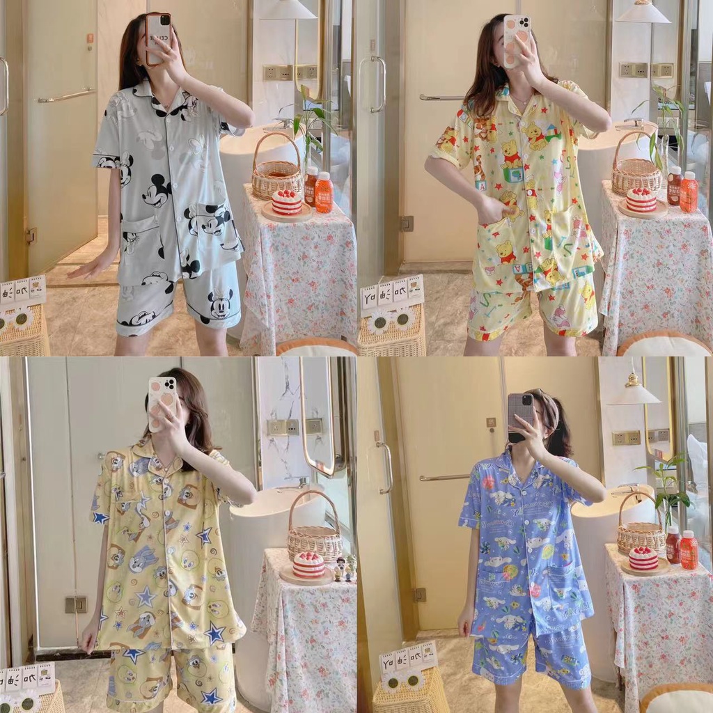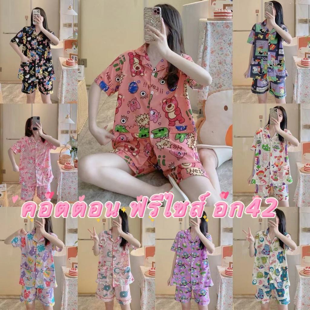 💥มาใหม่💥ชุดนอน เสื้อแขนสั้น + กางเกงขาสั้น ขนาดใหญ่ ผ้านิ่มมาก ลายน่ารักๆ กระดุมหน้า คอปก อก42 ฟรีไซส์ DD4